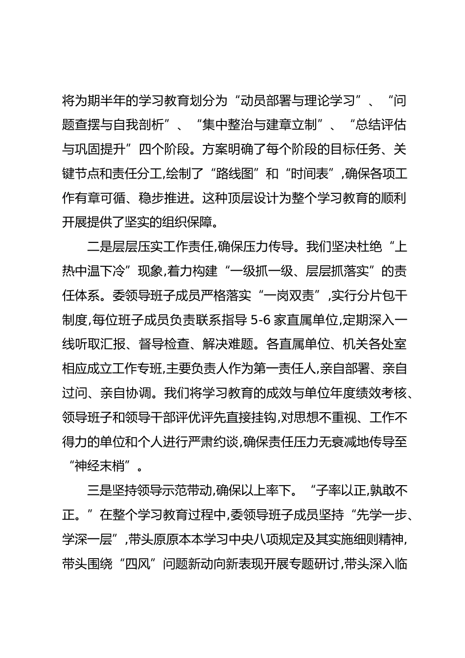 XX市衛(wèi)生健康局學(xué)習(xí)教育總結(jié)評估報告根據(jù)市委統(tǒng)一部署,自2025年3月以來,市衛(wèi)生健康委員會在全委系統(tǒng)內(nèi)組織開展了為期5個月的中央八項規(guī)定精神集中學(xué)習(xí)教育。學(xué)習(xí)教育覆蓋全委機(jī)關(guān)、58家直屬及相關(guān)單位,共計1.6萬余名黨員干部和關(guān)鍵崗位人員參與。期間,全系統(tǒng)累計組織黨委理論學(xué)習(xí)中心組專題學(xué)習(xí)130余次,開展專題研討交流50余場,深入基層調(diào)研400余次,全面排查梳理出4大類68項具體問題。通過系統(tǒng)謀劃、精心組織和扎實推進(jìn),本次學(xué)習(xí)教育取得了顯著的階段性成效,全系統(tǒng)作風(fēng)建設(shè)呈現(xiàn)出向上向好的新氣象。一、強(qiáng)化組織領(lǐng)導(dǎo),構(gòu)建齊抓共管的責(zé)任體系為確保學(xué)習(xí)教育高標(biāo)準(zhǔn)開局、高...