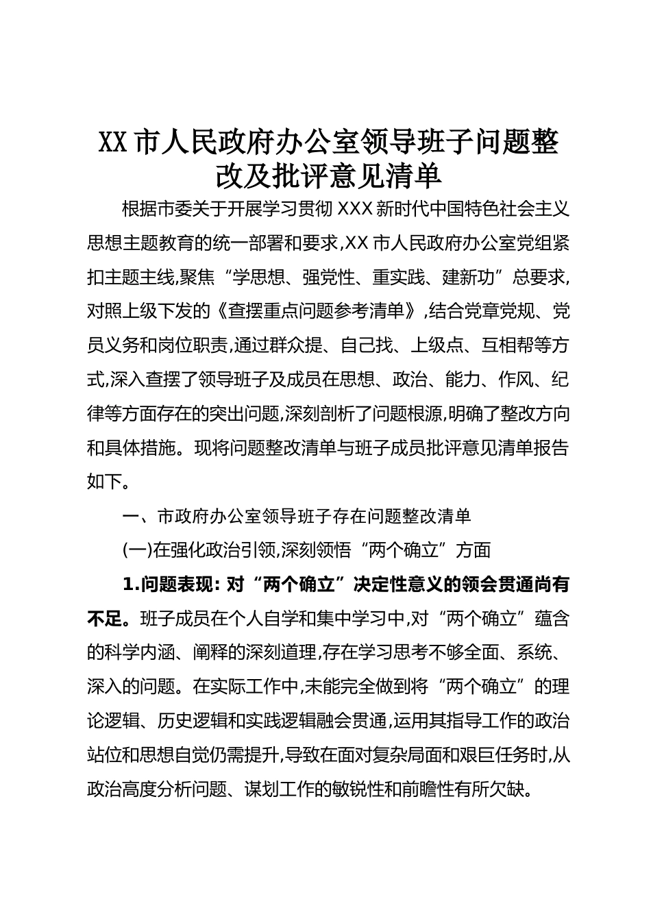 XX市人民政府辦公室領(lǐng)導(dǎo)班子問題整改及批評意見清單根據(jù)市委關(guān)于開展學(xué)習(xí)貫徹XXX新時代中國特色社會主義思想主題教育的統(tǒng)一部署和要求,XX市人民政府辦公室黨組緊扣主題主線,聚焦“學(xué)思想、強(qiáng)黨性、重實踐、建新功”總要求,對照上級下發(fā)的《查擺重點問題參考清單》,結(jié)合黨章黨規(guī)、黨員義務(wù)和崗位職責(zé),通過群眾提、自己找、上級點、互相幫等方式,深入查擺了領(lǐng)導(dǎo)班子及成員在思想、政治、能力、作風(fēng)、紀(jì)律等方面存在的突出問題,深刻剖析了問題根源,明確了整改方向和具體措施。現(xiàn)將問題整改清單與班子成員批評意見清單報告如下。一、市政府辦公室領(lǐng)導(dǎo)班子存在問題整改清單(一...