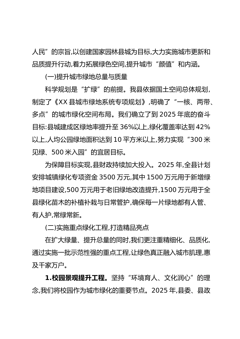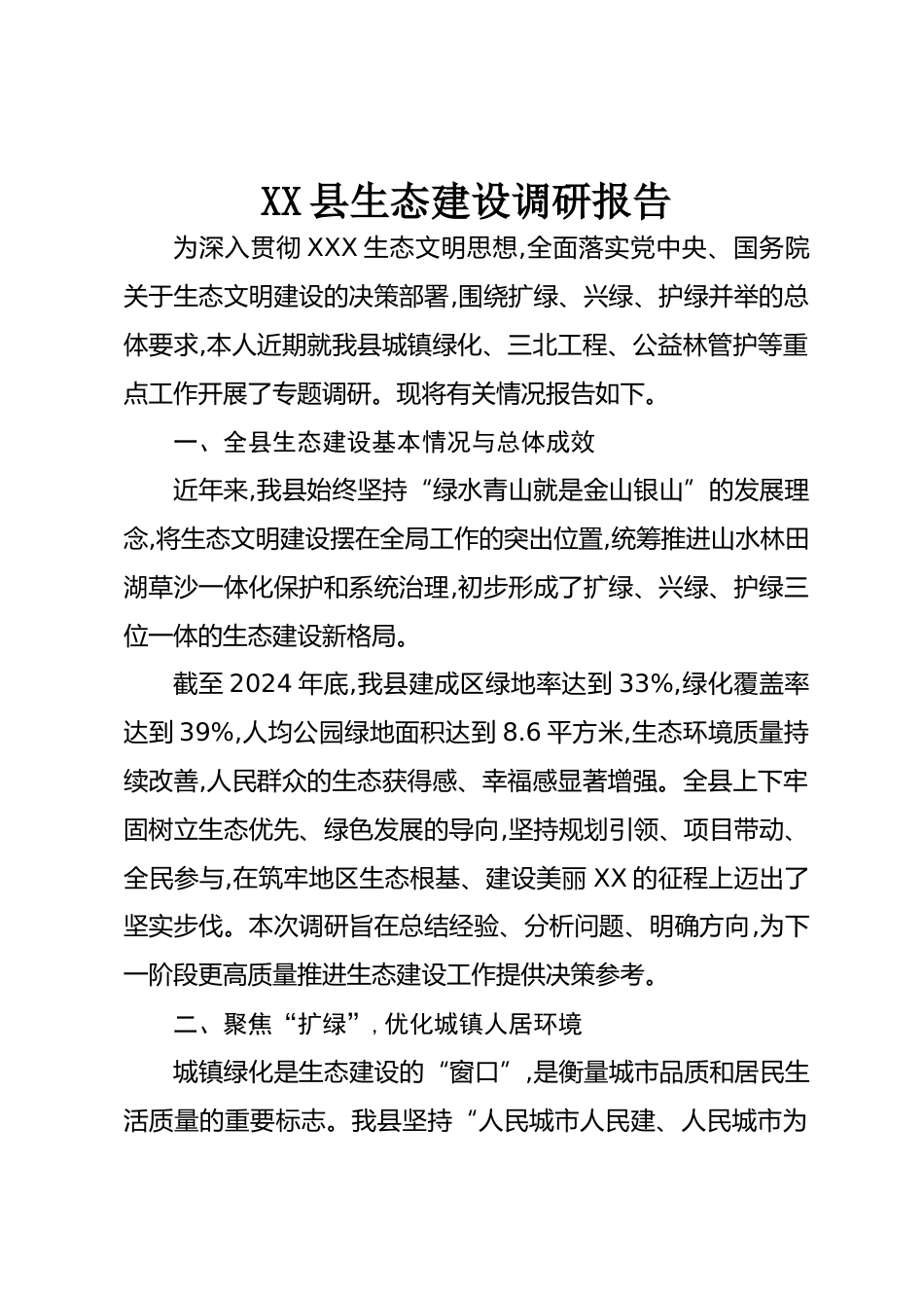 XX縣生態(tài)建設調研報告為深入貫徹XXX生態(tài)文明思想,全面落實黨中央、國務院關于生態(tài)文明建設的決策部署,圍繞擴綠、興綠、護綠并舉的總體要求,本人近期就我縣城鎮(zhèn)綠化、三北工程、公益林管護等重點工作開展了專題調研?,F(xiàn)將有關情況報告如下。一、全縣生態(tài)建設基本情況與總體成效近年來,我縣始終堅持“綠水青山就是金山銀山”的發(fā)展理念,將生態(tài)文明建設擺在全局工作的突出位置,統(tǒng)籌推進山水林田湖草沙一體化保護和系統(tǒng)治理,初步形成了擴綠、興綠、護綠三位一體的生態(tài)建設新格局。截至2024年底,我縣建成區(qū)綠地率達到33%,綠化覆蓋率達到39%,人均公園綠地面積達到8.6平方米,生...