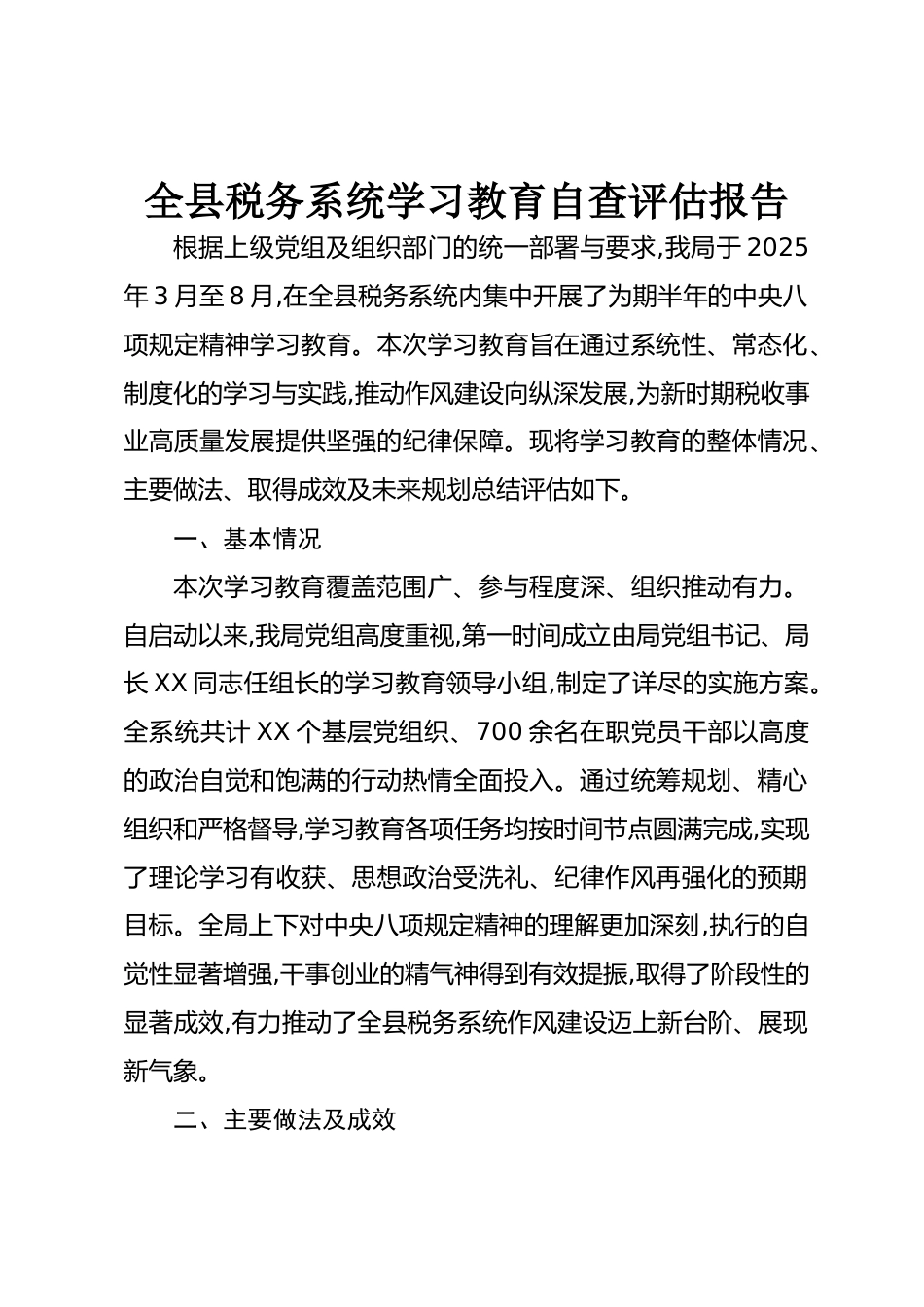 全縣稅務(wù)系統(tǒng)學(xué)習(xí)教育自查評(píng)估報(bào)告根據(jù)上級(jí)黨組及組織部門的統(tǒng)一部署與要求,我局于2025年3月至8月,在全縣稅務(wù)系統(tǒng)內(nèi)集中開展了為期半年的中央八項(xiàng)規(guī)定精神學(xué)習(xí)教育。本次學(xué)習(xí)教育旨在通過(guò)系統(tǒng)性、常態(tài)化、制度化的學(xué)習(xí)與實(shí)踐,推動(dòng)作風(fēng)建設(shè)向縱深發(fā)展,為新時(shí)期稅收事業(yè)高質(zhì)量發(fā)展提供堅(jiān)強(qiáng)的紀(jì)律保障?,F(xiàn)將學(xué)習(xí)教育的整體情況、主要做法、取得成效及未來(lái)規(guī)劃總結(jié)評(píng)估如下。一、基本情況本次學(xué)習(xí)教育覆蓋范圍廣、參與程度深、組織推動(dòng)有力。自啟動(dòng)以來(lái),我局黨組高度重視,第一時(shí)間成立由局黨組書記、局長(zhǎng)XX同志任組長(zhǎng)的學(xué)習(xí)教育領(lǐng)導(dǎo)小組,制定了詳盡的實(shí)施方案。全系統(tǒng)共計(jì)XX...