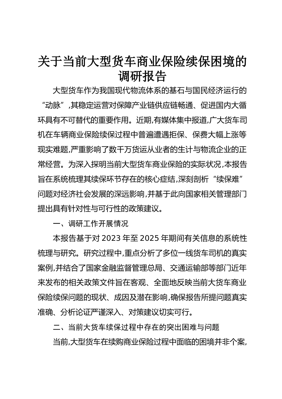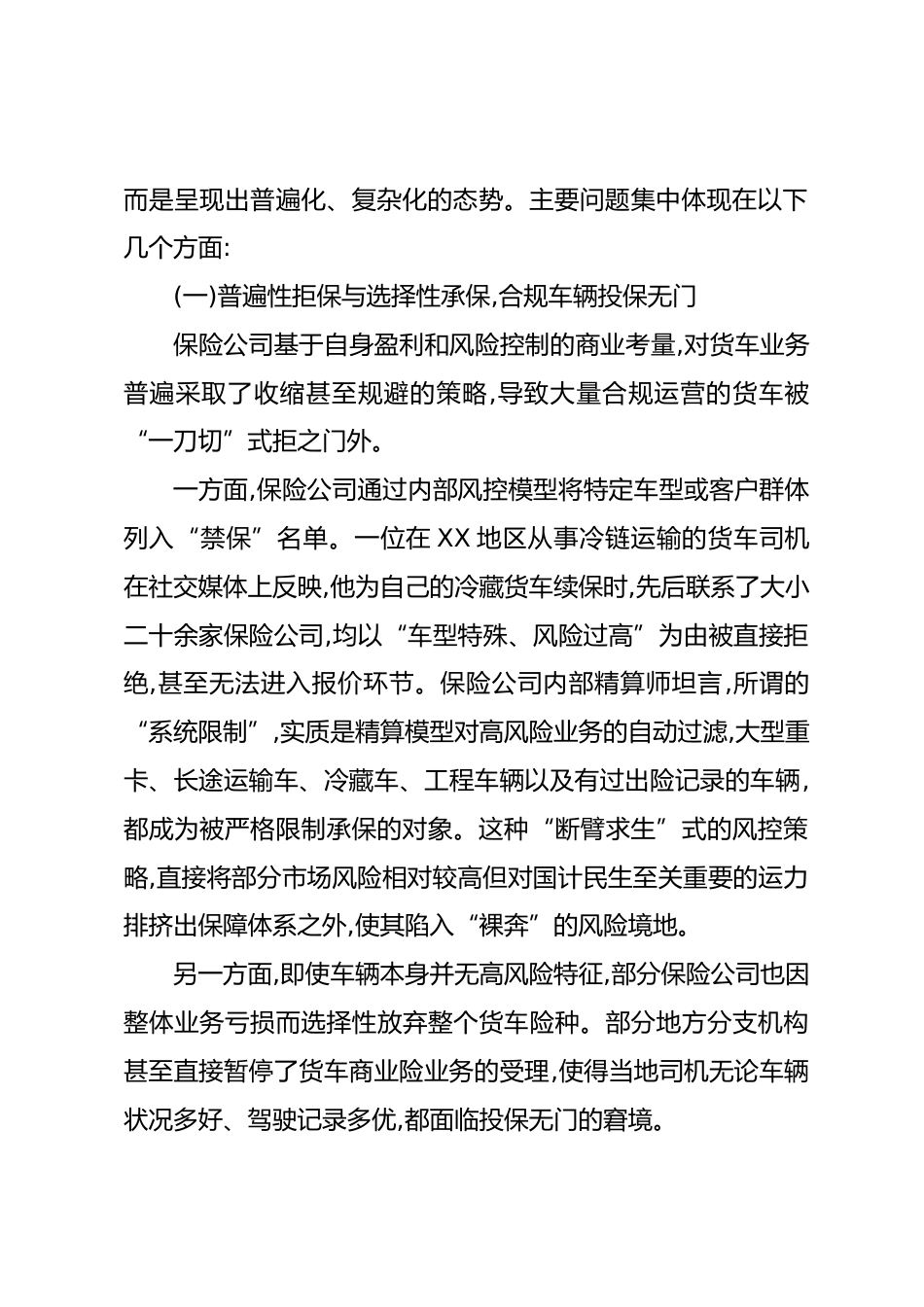 關(guān)于當(dāng)前大型貨車(chē)商業(yè)保險(xiǎn)續(xù)保困境的調(diào)研報(bào)告大型貨車(chē)作為我國(guó)現(xiàn)代物流體系的基石與國(guó)民經(jīng)濟(jì)運(yùn)行的“動(dòng)脈”,其穩(wěn)定運(yùn)營(yíng)對(duì)保障產(chǎn)業(yè)鏈供應(yīng)鏈暢通、促進(jìn)國(guó)內(nèi)大循環(huán)具有不可替代的重要作用。近期,有媒體集中報(bào)道,廣大貨車(chē)司機(jī)在車(chē)輛商業(yè)保險(xiǎn)續(xù)保過(guò)程中普遍遭遇拒保、保費(fèi)大幅上漲等現(xiàn)實(shí)難題,嚴(yán)重影響了數(shù)千萬(wàn)貨運(yùn)從業(yè)者的生計(jì)與物流企業(yè)的正常經(jīng)營(yíng)。為深入探明當(dāng)前大型貨車(chē)商業(yè)保險(xiǎn)的實(shí)際狀況,本報(bào)告旨在系統(tǒng)梳理其續(xù)保環(huán)節(jié)存在的核心癥結(jié),深刻剖析“續(xù)保難”問(wèn)題對(duì)經(jīng)濟(jì)社會(huì)發(fā)展的深遠(yuǎn)影響,并基于此向國(guó)家相關(guān)管理部門(mén)提出具有針對(duì)性與可行性的政策建議。一、調(diào)研工作開(kāi)展情...
