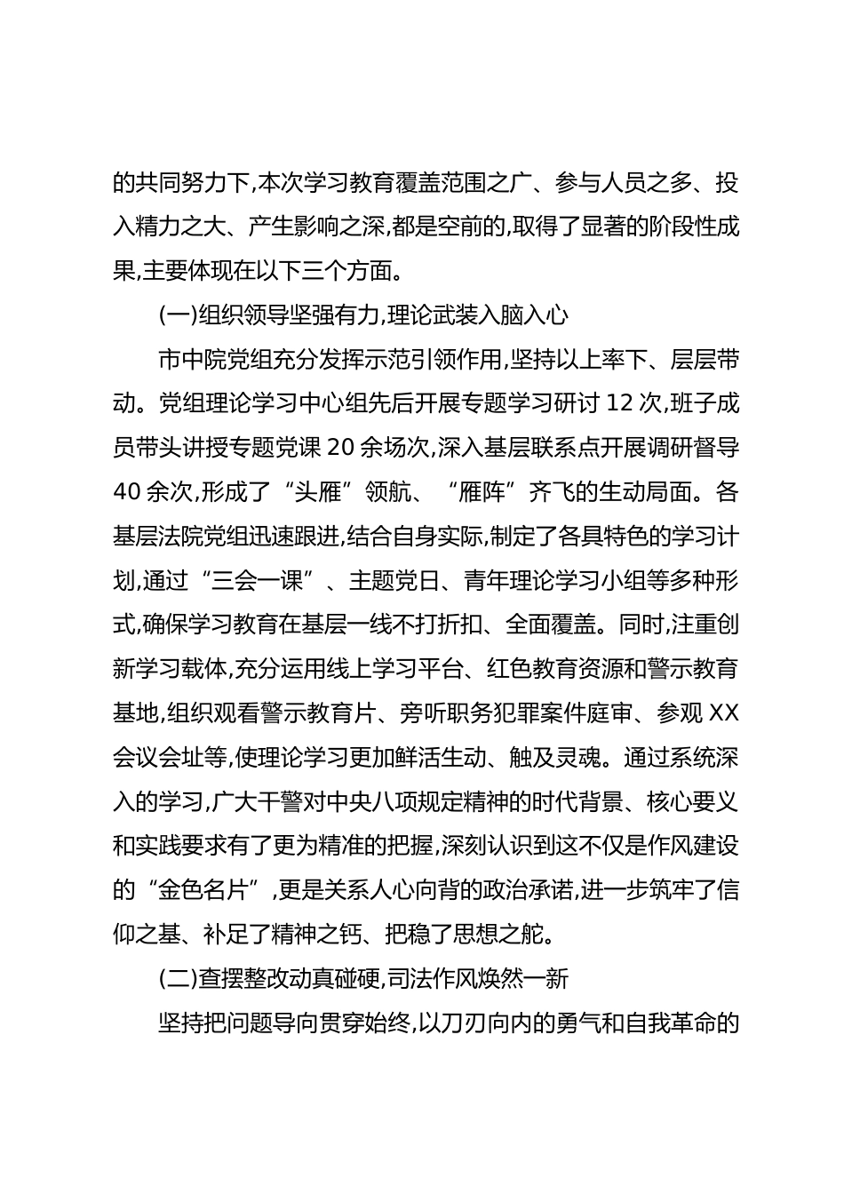 在XX市法院深入貫徹中央八項規(guī)定精神學(xué)習(xí)教育總結(jié)大會上的講話同志們:今天,我們在此召開全市法院深入貫徹中央八項規(guī)定精神學(xué)習(xí)教育總結(jié)大會。主要任務(wù)是,系統(tǒng)回顧本次學(xué)習(xí)教育的歷程與成果,客觀分析存在的短板與不足,并對下一步鞏固深化學(xué)習(xí)教育成果、構(gòu)建作風(fēng)建設(shè)長效機制進(jìn)行全面部署。目的就是要動員全市兩級法院全體干警,將此次學(xué)習(xí)教育中激發(fā)出的政治熱情、思想覺悟和工作干勁,持續(xù)不斷地轉(zhuǎn)化為服務(wù)大局、司法為民、公正司法的強大動力,以永不懈怠的精神狀態(tài)和一往無前的奮斗姿態(tài),推動XX法院工作實現(xiàn)更高質(zhì)量的發(fā)展。下面,我講三點意見。一、回顧總結(jié),成效卓著,學(xué)...
