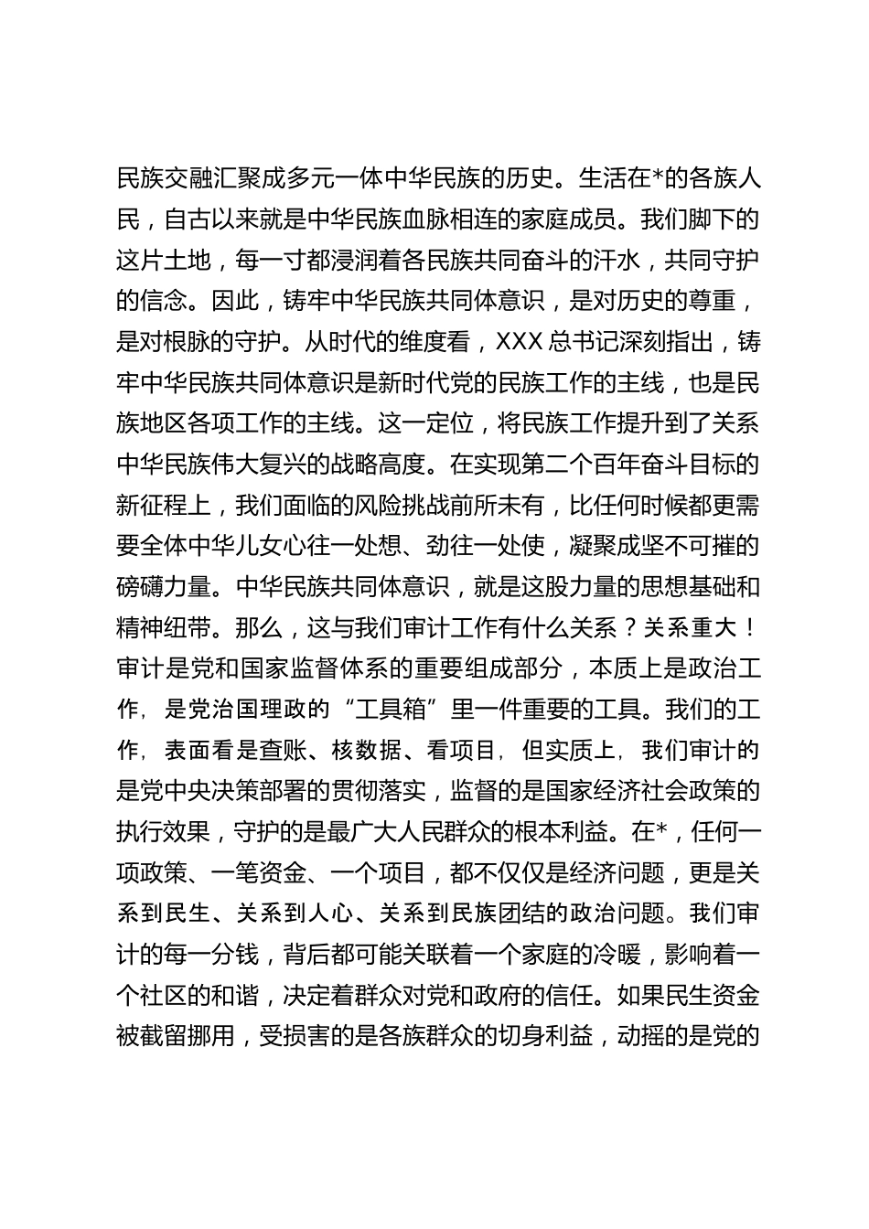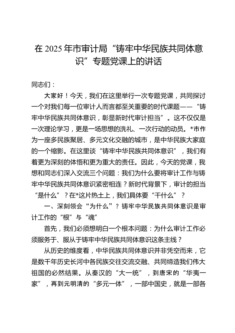 在2025年市審計(jì)局“鑄牢中華民族共同體意識”專題黨課上的講話同志們:大家好!今天,我們在這里舉行一次專題黨課,共同探討一個對我們每一位審計(jì)人而言都至關(guān)重要的時代課題——“鑄牢中華民族共同體意識,彰顯新時代審計(jì)擔(dān)當(dāng)”。這不僅僅是一次理論學(xué)習(xí),更是一場思想的洗禮、一次行動的動員。*市作為一座多民族聚居、多元文化交融的城市,是中華民族大家庭的一個縮影。在這里談“鑄牢中華民族共同體意識”,我們有著更為深刻的體悟和更為重大的責(zé)任。因此,今天的黨課,我想和同志們深入交流三個問題:我們?yōu)槭裁匆獙徲?jì)工作與鑄牢中華民族共同體意識緊密相連?新時...