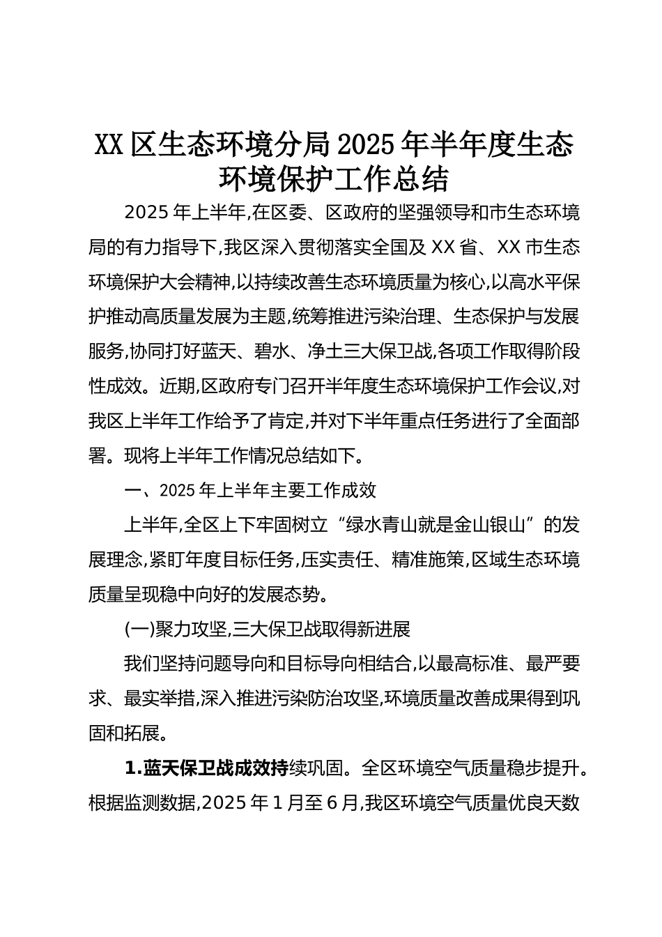XX區(qū)生態(tài)環(huán)境分局2025年半年度生態(tài)環(huán)境保護工作總結(jié)