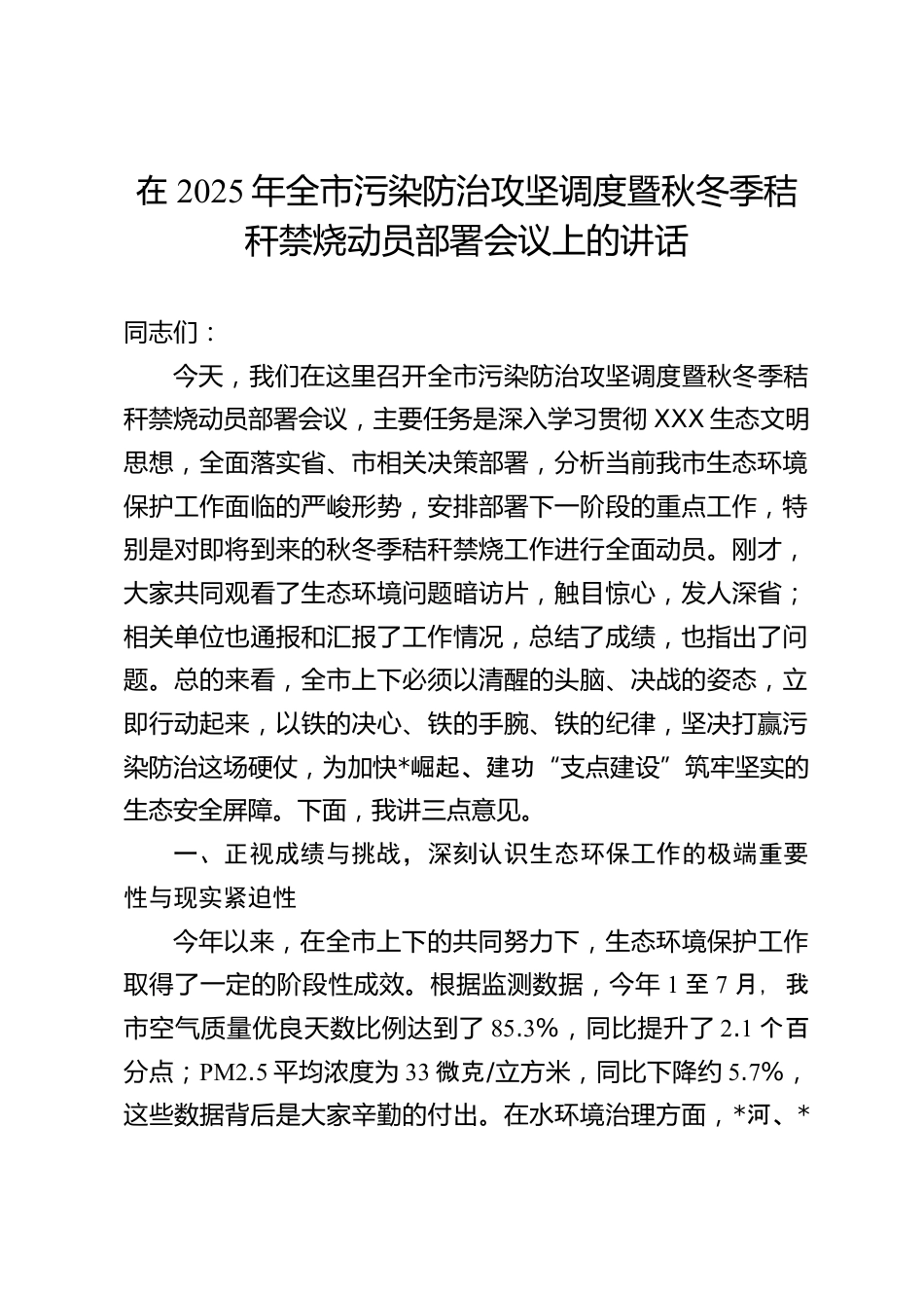 在2025年全市污染防治攻堅調(diào)度暨秋冬季秸稈禁燒動員部署會議上的講話VIP免費