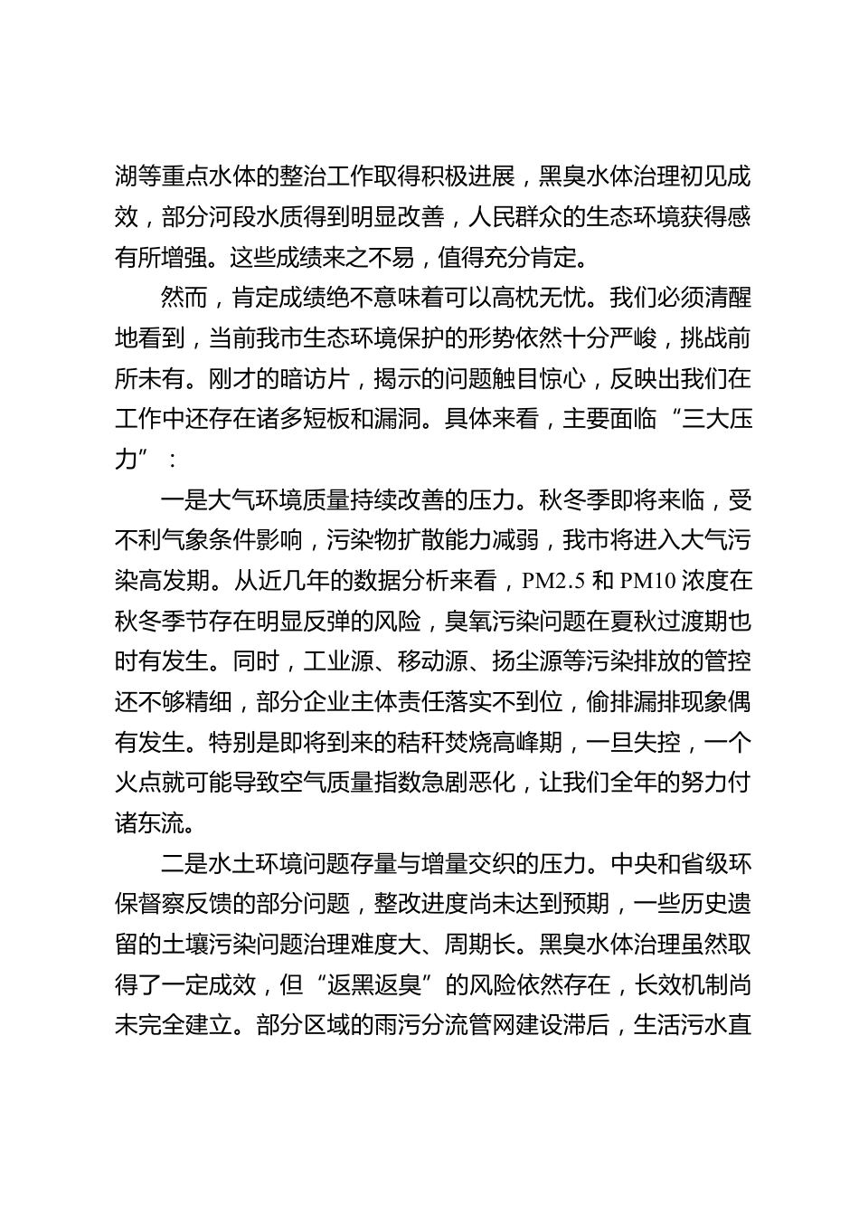 在2025年全市污染防治攻堅調(diào)度暨秋冬季秸稈禁燒動員部署會議上的講話同志們:今天,我們在這里召開全市污染防治攻堅調(diào)度暨秋冬季秸稈禁燒動員部署會議,主要任務(wù)是深入學(xué)習(xí)貫徹XXX生態(tài)文明思想,全面落實省、市相關(guān)決策部署,分析當(dāng)前我市生態(tài)環(huán)境保護工作面臨的嚴峻形勢,安排部署下一階段的重點工作,特別是對即將到來的秋冬季秸稈禁燒工作進行全面動員。剛才,大家共同觀看了生態(tài)環(huán)境問題暗訪片,觸目驚心,發(fā)人深??;相關(guān)單位也通報和匯報了工作情況,總結(jié)了成績,也指出了問題。總的來看,全市上下必須以清醒的頭腦、決戰(zhàn)的姿態(tài),立即行動起來,以鐵的決心、鐵的手...