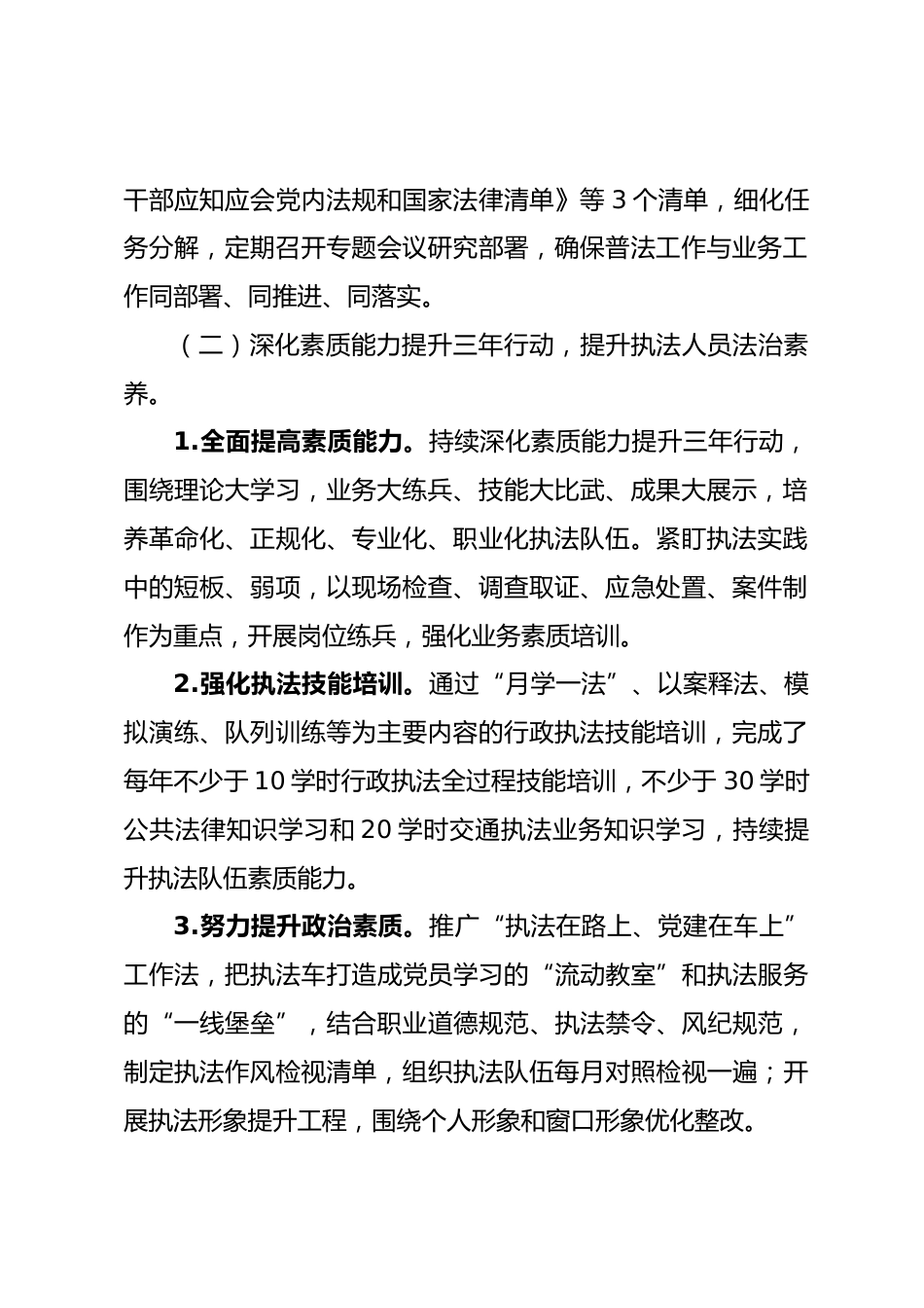 X市交通運輸局開展法治宣傳教育第八個五年規(guī)劃工作總結自2021年“八五”普法工作啟動以來,X市交通運輸局堅持以XXX新時代中國特色社會主義思想為指導,認真學習貫徹XXX法治思想,緊扣第八個五年普法規(guī)劃總體要求,堅持法治宣傳教育與法治實踐深度融合,聚焦交通運輸行業(yè)特點,創(chuàng)新形式、突出重點、壓實責任,深入推進交通運輸行業(yè)尊法學法守法用法,不斷夯實交通運輸法治政府部門建設,為全市交通運輸事業(yè)高質量發(fā)展營造良好法治環(huán)境?,F(xiàn)將工作開展情況總結如下:一、工作開展情況(一)強化組織領導,壓實普法責任。堅持把“八五”普法作為法治交通建設的重要抓手,構建...