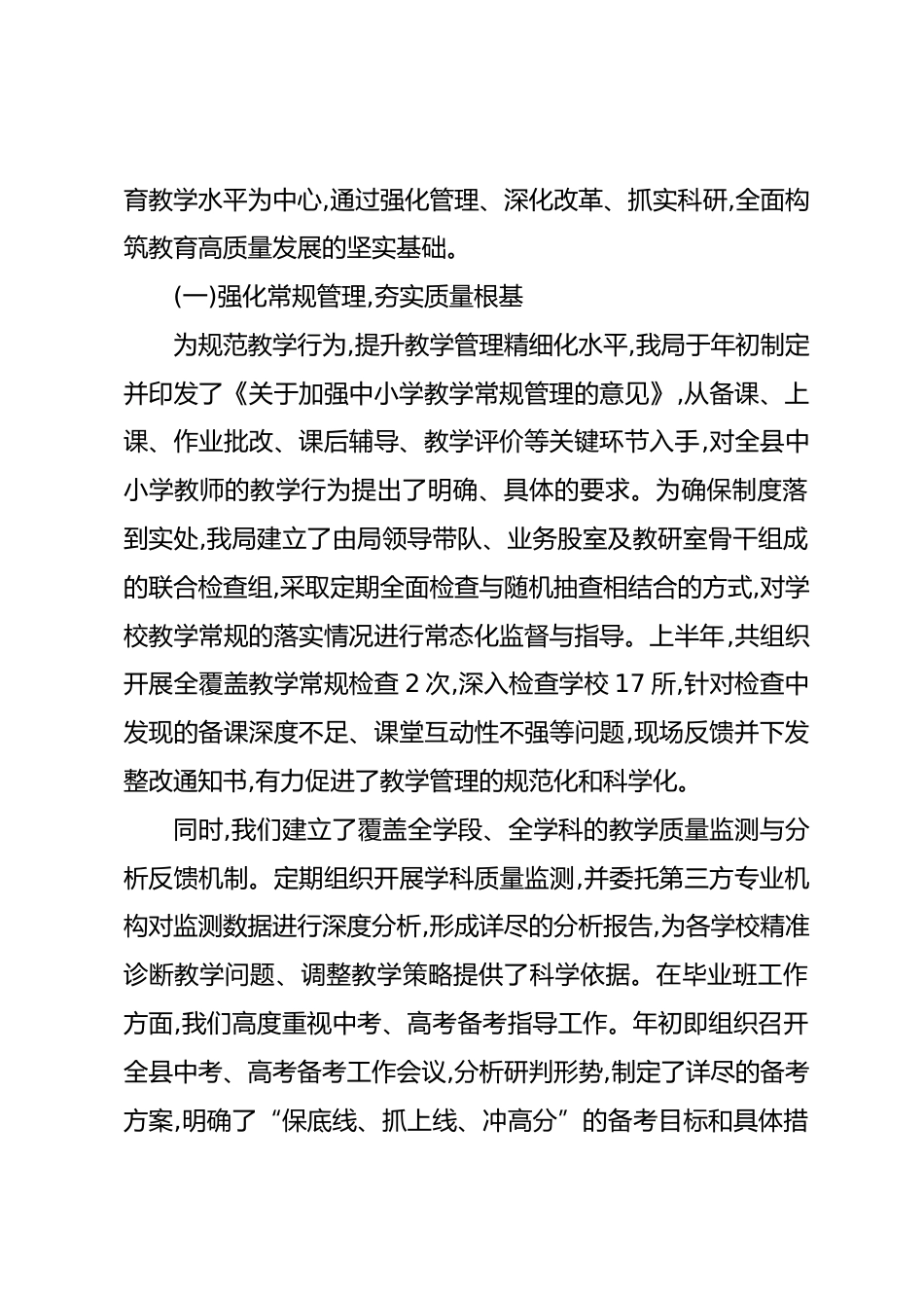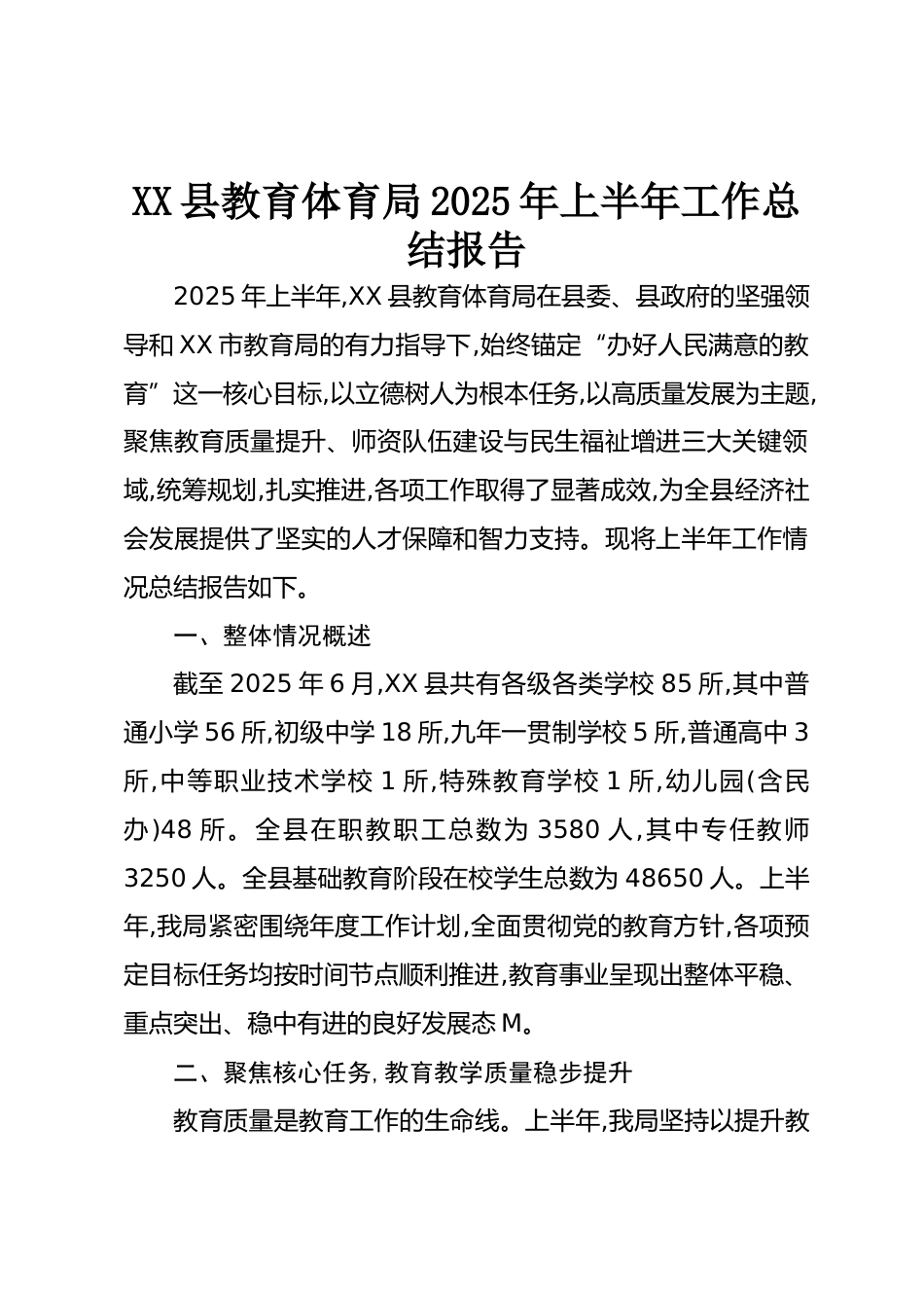 XX縣教育體育局2025年上半年工作總結(jié)報(bào)告2025年上半年,XX縣教育體育局在縣委、縣政府的堅(jiān)強(qiáng)領(lǐng)導(dǎo)和XX市教育局的有力指導(dǎo)下,始終錨定“辦好人民滿意的教育”這一核心目標(biāo),以立德樹(shù)人為根本任務(wù),以高質(zhì)量發(fā)展為主題,聚焦教育質(zhì)量提升、師資隊(duì)伍建設(shè)與民生福祉增進(jìn)三大關(guān)鍵領(lǐng)域,統(tǒng)籌規(guī)劃,扎實(shí)推進(jìn),各項(xiàng)工作取得了顯著成效,為全縣經(jīng)濟(jì)社會(huì)發(fā)展提供了堅(jiān)實(shí)的人才保障和智力支持?,F(xiàn)將上半年工作情況總結(jié)報(bào)告如下。一、整體情況概述截至2025年6月,XX縣共有各級(jí)各類學(xué)校85所,其中普通小學(xué)56所,初級(jí)中學(xué)18所,九年一貫制學(xué)校5所,普通高中3所,中等職業(yè)技術(shù)學(xué)校1所,特殊教育學(xué)校1所,幼...