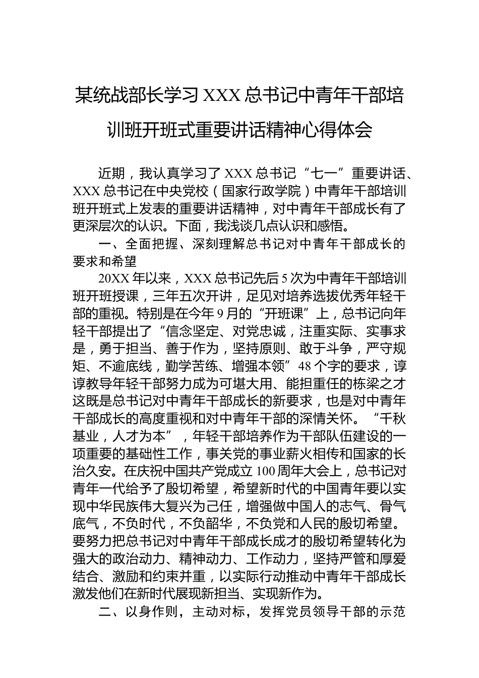 某統(tǒng)戰(zhàn)部長(zhǎng)學(xué)習(xí)XXX總書記中青年干部培訓(xùn)班開班式重要講話精神心得體會(huì)近期,我認(rèn)真學(xué)習(xí)了XXX總書記“七一”重要講話、XXX總書記在中央黨校(國家行政學(xué)院)中青年干部培訓(xùn)班開班式上發(fā)表的重要講話精神,對(duì)中青年干部成長(zhǎng)有了更深層次的認(rèn)識(shí)。下面,我淺談幾點(diǎn)認(rèn)識(shí)和感悟。一、全面把握、深刻理解總書記對(duì)中青年干部成長(zhǎng)的要求和希望20XX年以來,XXX總書記先后5次為中青年干部培訓(xùn)班開班授課,三年五次開講,足見對(duì)培養(yǎng)選拔優(yōu)秀年輕干部的重視。特別是在今年9月的“開班課”上,總書記向年輕干部提出了“信念堅(jiān)定、對(duì)黨忠誠,注重實(shí)際、實(shí)事求是,勇于擔(dān)當(dāng)、善于作為,堅(jiān)...