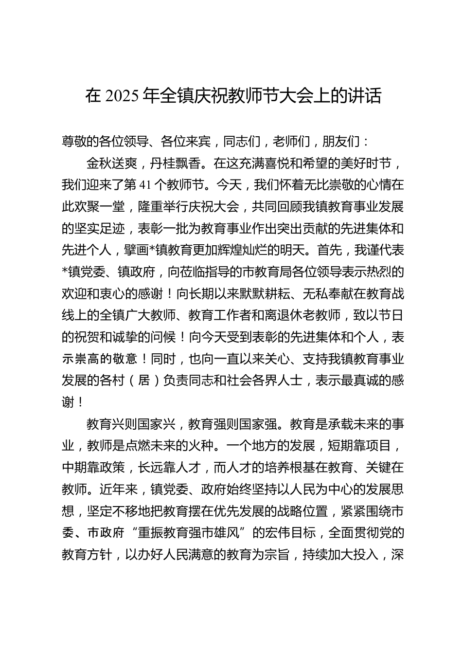 在2025年全鎮(zhèn)慶祝教師節(jié)大會上的講話VIP免費