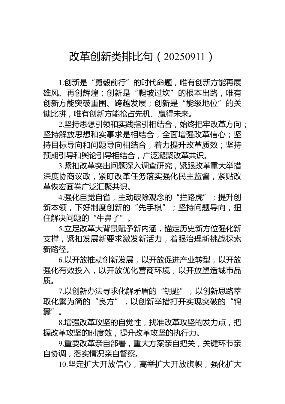 改革創(chuàng)新類排比句(20250911)1.創(chuàng)新是“勇毅前行”的時代命題,唯有創(chuàng)新方能再展雄風(fēng)、再創(chuàng)輝煌;創(chuàng)新是“爬坡過坎”的根本出路,唯有創(chuàng)新方能突破重圍、跨越發(fā)展;創(chuàng)新是“能級地位”的關(guān)鍵比拼,唯有創(chuàng)新方能搶占先機(jī)、贏得未來。2.堅持思想引領(lǐng)和實踐指引相結(jié)合,始終把牢改革方向;堅持解放思想和實事求是相結(jié)合,全面增強改革信心;堅持目標(biāo)導(dǎo)向和問題導(dǎo)向相結(jié)合,著力提升改革質(zhì)效;堅持預(yù)期引導(dǎo)和輿論引導(dǎo)相結(jié)合,廣泛凝聚改革共識。3.緊扣改革突出問題深入調(diào)查研究,緊跟改革重大舉措深度協(xié)商議政,緊盯改革任務(wù)落實強化民主監(jiān)督,緊貼改革恢宏畫卷廣泛匯聚共識...