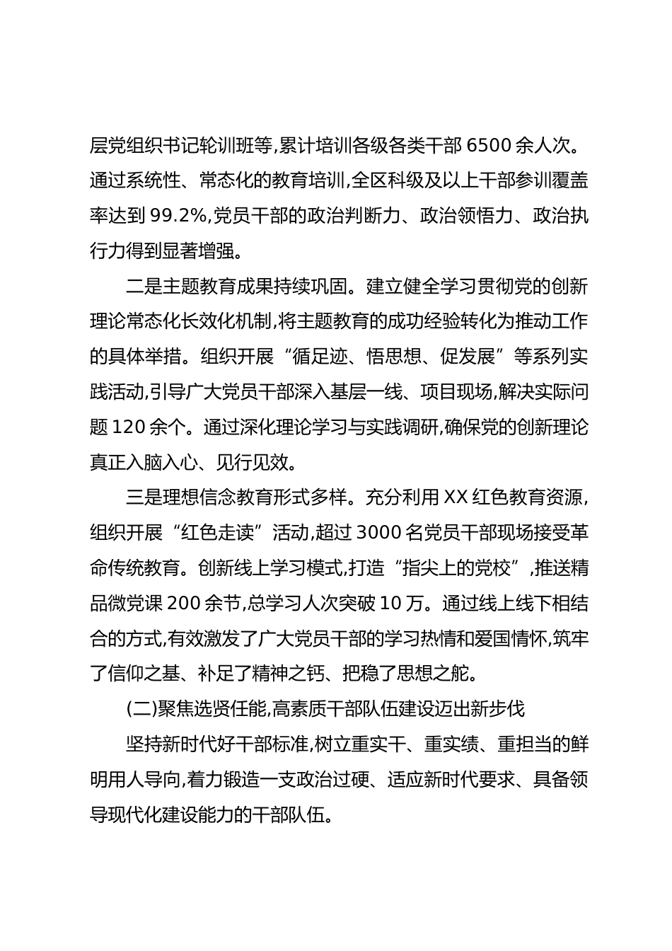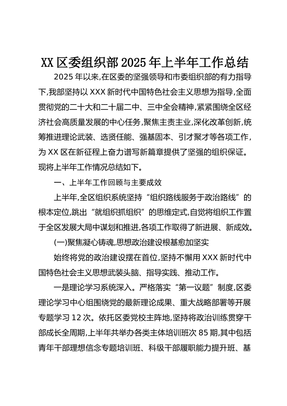 XX區(qū)委組織部2025年上半年工作總結(jié)2025年以來,在區(qū)委的堅(jiān)強(qiáng)領(lǐng)導(dǎo)和市委組織部的有力指導(dǎo)下,我部堅(jiān)持以XXX新時代中國特色社會主義思想為指導(dǎo),全面貫徹黨的二十大和二十屆二中、三中全會精神,緊緊圍繞全區(qū)經(jīng)濟(jì)社會高質(zhì)量發(fā)展的中心任務(wù),聚焦主責(zé)主業(yè),深化改革創(chuàng)新,統(tǒng)籌推進(jìn)理論武裝、選賢任能、強(qiáng)基固本、引才聚才等各項(xiàng)工作,為XX區(qū)在新征程上奮力譜寫新篇章提供了堅(jiān)強(qiáng)的組織保證。現(xiàn)將上半年工作情況總結(jié)如下。一、上半年工作回顧與主要成效上半年,全區(qū)組織系統(tǒng)堅(jiān)持“組織路線服務(wù)于政治路線”的根本定位,跳出“就組織抓組織”的思維定式,自覺將組織工作置于全區(qū)發(fā)展大局中...