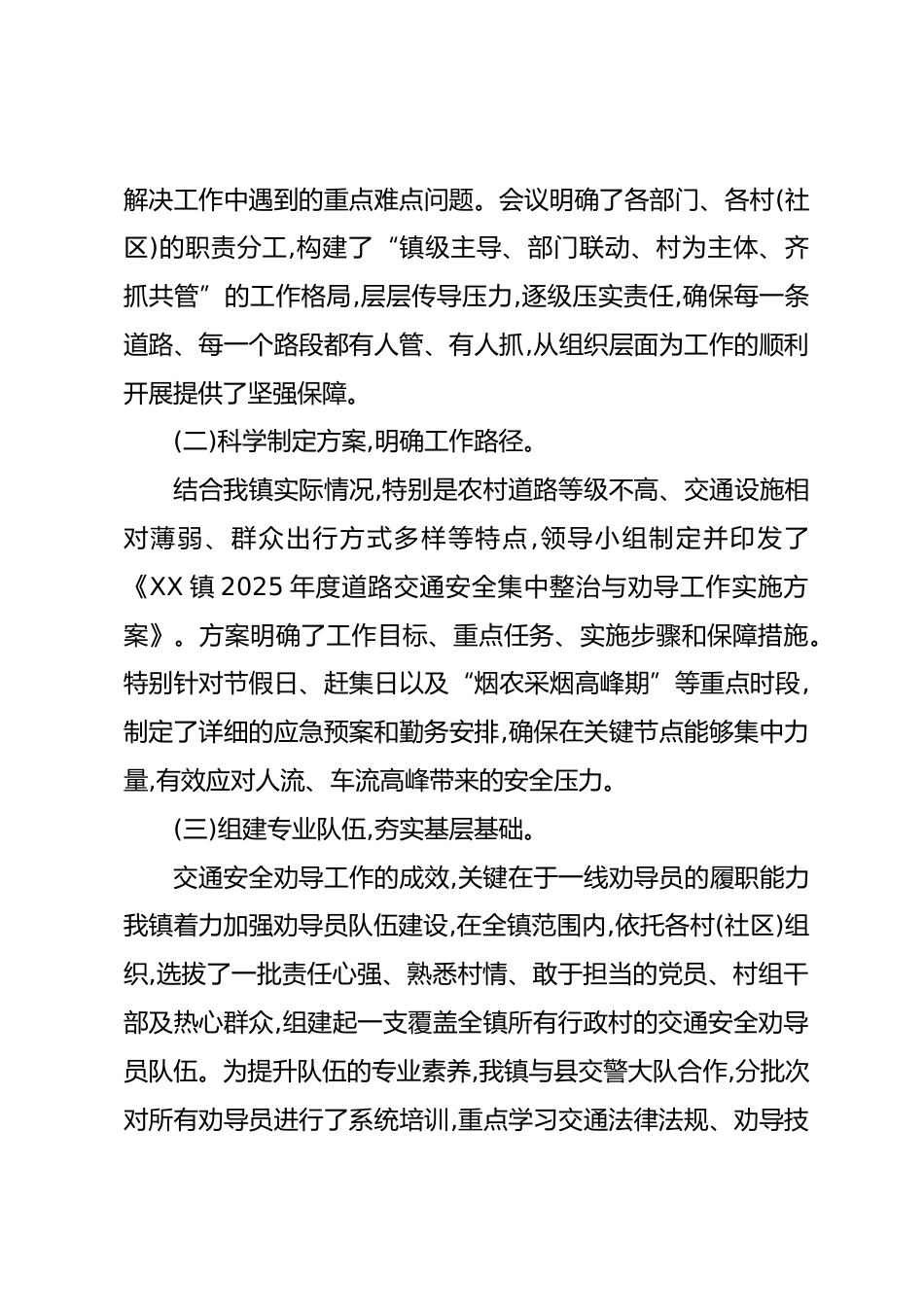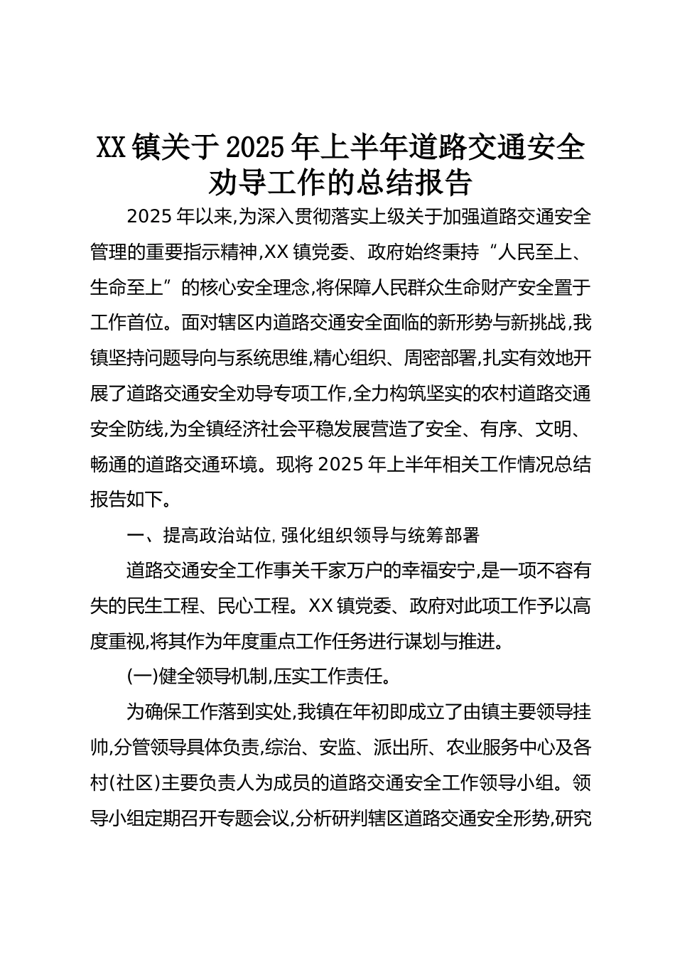 XX鎮(zhèn)關(guān)于2025年上半年道路交通安全勸導(dǎo)工作的總結(jié)報告2025年以來,為深入貫徹落實上級關(guān)于加強道路交通安全管理的重要指示精神,XX鎮(zhèn)黨委、政府始終秉持“人民至上、生命至上”的核心安全理念,將保障人民群眾生命財產(chǎn)安全置于工作首位。面對轄區(qū)內(nèi)道路交通安全面臨的新形勢與新挑戰(zhàn),我鎮(zhèn)堅持問題導(dǎo)向與系統(tǒng)思維,精心組織、周密部署,扎實有效地開展了道路交通安全勸導(dǎo)專項工作,全力構(gòu)筑堅實的農(nóng)村道路交通安全防線,為全鎮(zhèn)經(jīng)濟社會平穩(wěn)發(fā)展?fàn)I造了安全、有序、文明、暢通的道路交通環(huán)境?,F(xiàn)將2025年上半年相關(guān)工作情況總結(jié)報告如下。一、提高政治站位,強化組織領(lǐng)導(dǎo)與統(tǒng)籌部署...