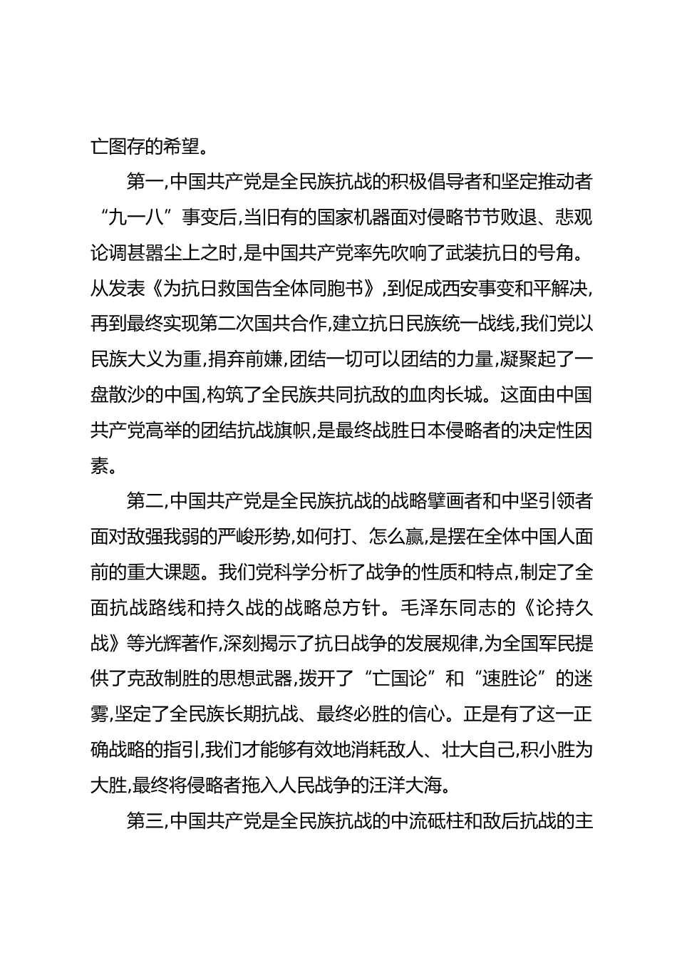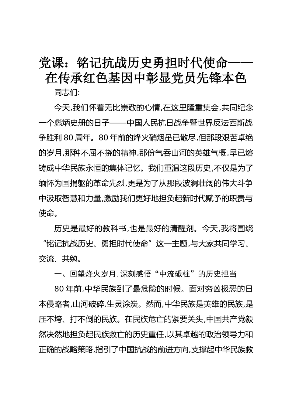 黨課:銘記抗戰(zhàn)歷史勇?lián)鷷r(shí)代使命——在傳承紅色基因中彰顯黨員先鋒本色同志們:今天,我們懷著無比崇敬的心情,在這里隆重集會,共同紀(jì)念一個(gè)彪炳史冊的日子——中國人民抗日戰(zhàn)爭暨世界反法西斯戰(zhàn)爭勝利80周年。80年前的烽火硝煙雖已散盡,但那段艱苦卓絕的歲月,那種不屈不撓的精神,那份氣吞山河的英雄氣概,早已熔鑄成中華民族永恒的集體記憶。我們重溫這段歷史,不僅是為了緬懷為國捐軀的革命先烈,更是為了從那段波瀾壯闊的偉大斗爭中汲取智慧和力量,激勵我們更好地?fù)?dān)負(fù)起新時(shí)代賦予的職責(zé)與使命。歷史是最好的教科書,也是最好的清醒劑。今天,我將圍繞“銘記抗戰(zhàn)歷史、勇?lián)鷷r(shí)...