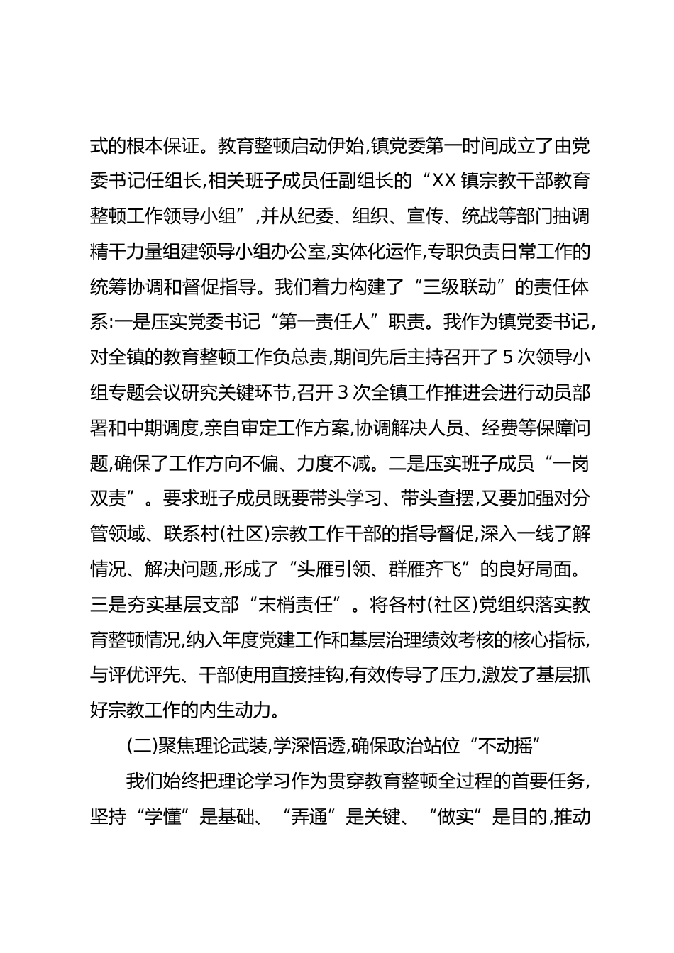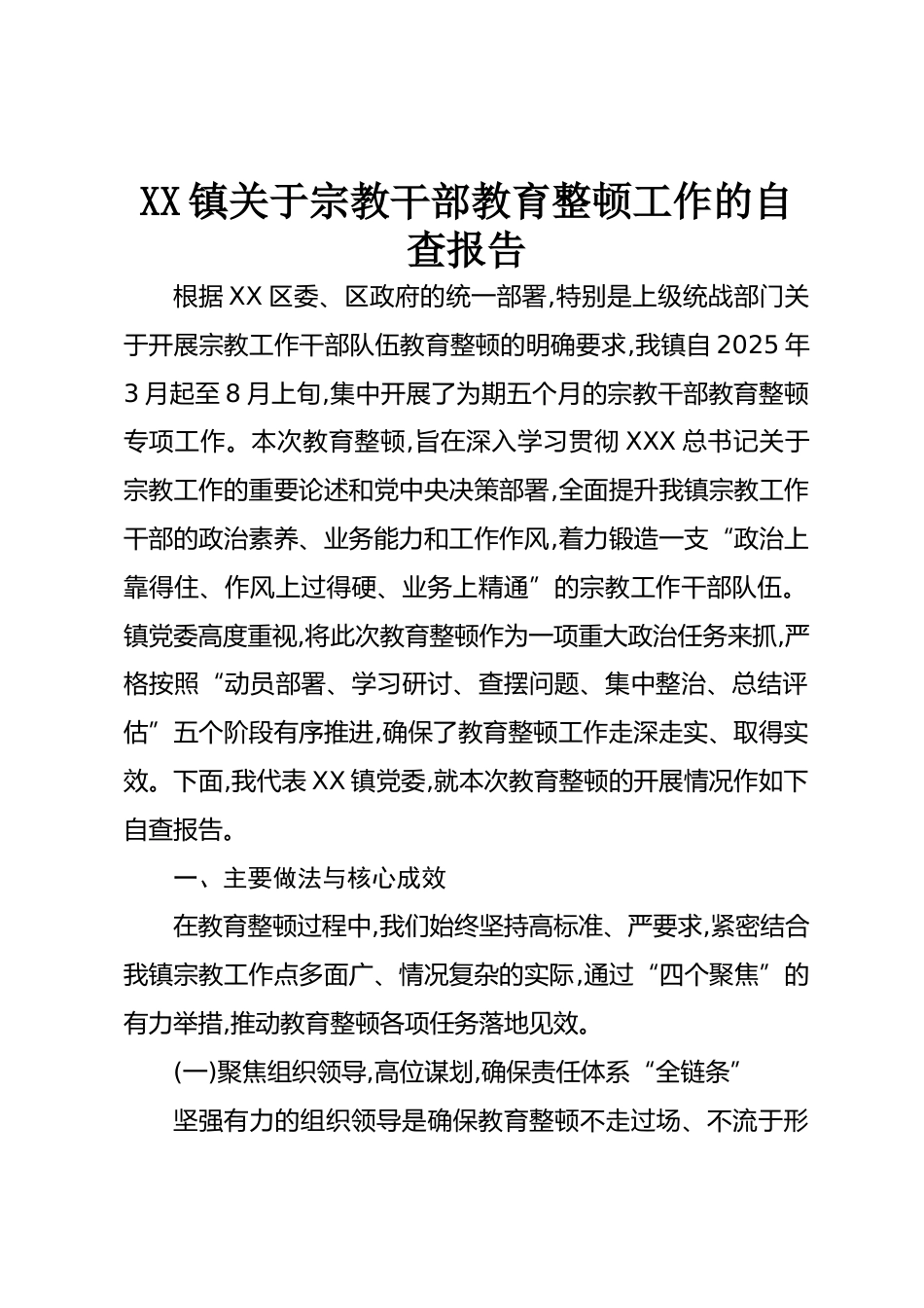 XX鎮(zhèn)關(guān)于宗教干部教育整頓工作的自查報(bào)告根據(jù)XX區(qū)委、區(qū)政府的統(tǒng)一部署,特別是上級(jí)統(tǒng)戰(zhàn)部門關(guān)于開展宗教工作干部隊(duì)伍教育整頓的明確要求,我鎮(zhèn)自2025年3月起至8月上旬,集中開展了為期五個(gè)月的宗教干部教育整頓專項(xiàng)工作。本次教育整頓,旨在深入學(xué)習(xí)貫徹XXX總書記關(guān)于宗教工作的重要論述和黨中央決策部署,全面提升我鎮(zhèn)宗教工作干部的政治素養(yǎng)、業(yè)務(wù)能力和工作作風(fēng),著力鍛造一支“政治上靠得住、作風(fēng)上過(guò)得硬、業(yè)務(wù)上精通”的宗教工作干部隊(duì)伍。鎮(zhèn)黨委高度重視,將此次教育整頓作為一項(xiàng)重大政治任務(wù)來(lái)抓,嚴(yán)格按照“動(dòng)員部署、學(xué)習(xí)研討、查擺問(wèn)題、集中整治、總結(jié)評(píng)估”五個(gè)階...