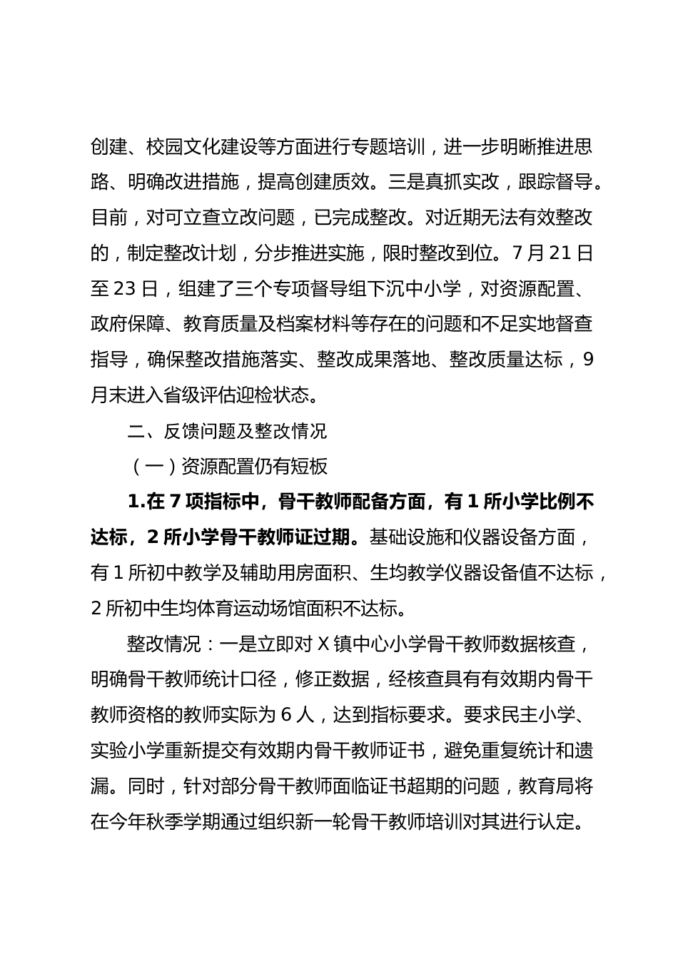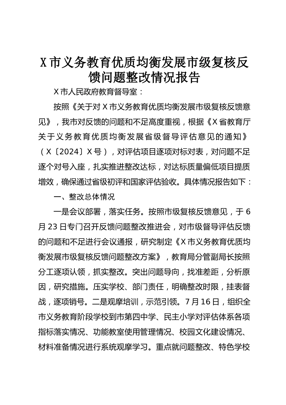 X市義務(wù)教育優(yōu)質(zhì)均衡發(fā)展市級(jí)復(fù)核反饋問題整改情況報(bào)告X市人民政府教育督導(dǎo)室:按照《關(guān)于對(duì)X市義務(wù)教育優(yōu)質(zhì)均衡發(fā)展市級(jí)復(fù)核反饋意見》,我市對(duì)反饋的問題和不足高度重視,根據(jù)《X省教育廳關(guān)于義務(wù)教育優(yōu)質(zhì)均衡發(fā)展省級(jí)督導(dǎo)評(píng)估意見的通知》(X〔2024〕X號(hào)),對(duì)評(píng)估項(xiàng)目逐項(xiàng)對(duì)標(biāo)對(duì)表,對(duì)問題不足逐個(gè)對(duì)號(hào)入座,扎實(shí)推進(jìn)整改達(dá)標(biāo),對(duì)達(dá)標(biāo)質(zhì)量偏低項(xiàng)目提質(zhì)增效,確保通過省級(jí)初評(píng)和國家評(píng)估驗(yàn)收。具體情況報(bào)告如下:一、整改總體情況一是會(huì)議部署,落實(shí)任務(wù)。按照市級(jí)復(fù)核反饋意見,于6月23日專門召開反饋問題整改推進(jìn)會(huì),對(duì)市級(jí)督導(dǎo)評(píng)估反饋的問題和不足進(jìn)行會(huì)議通報(bào),...