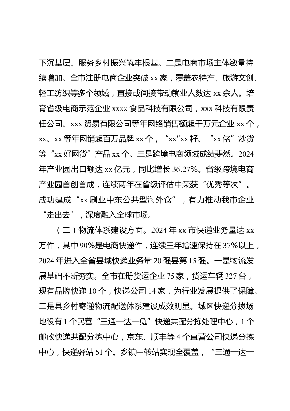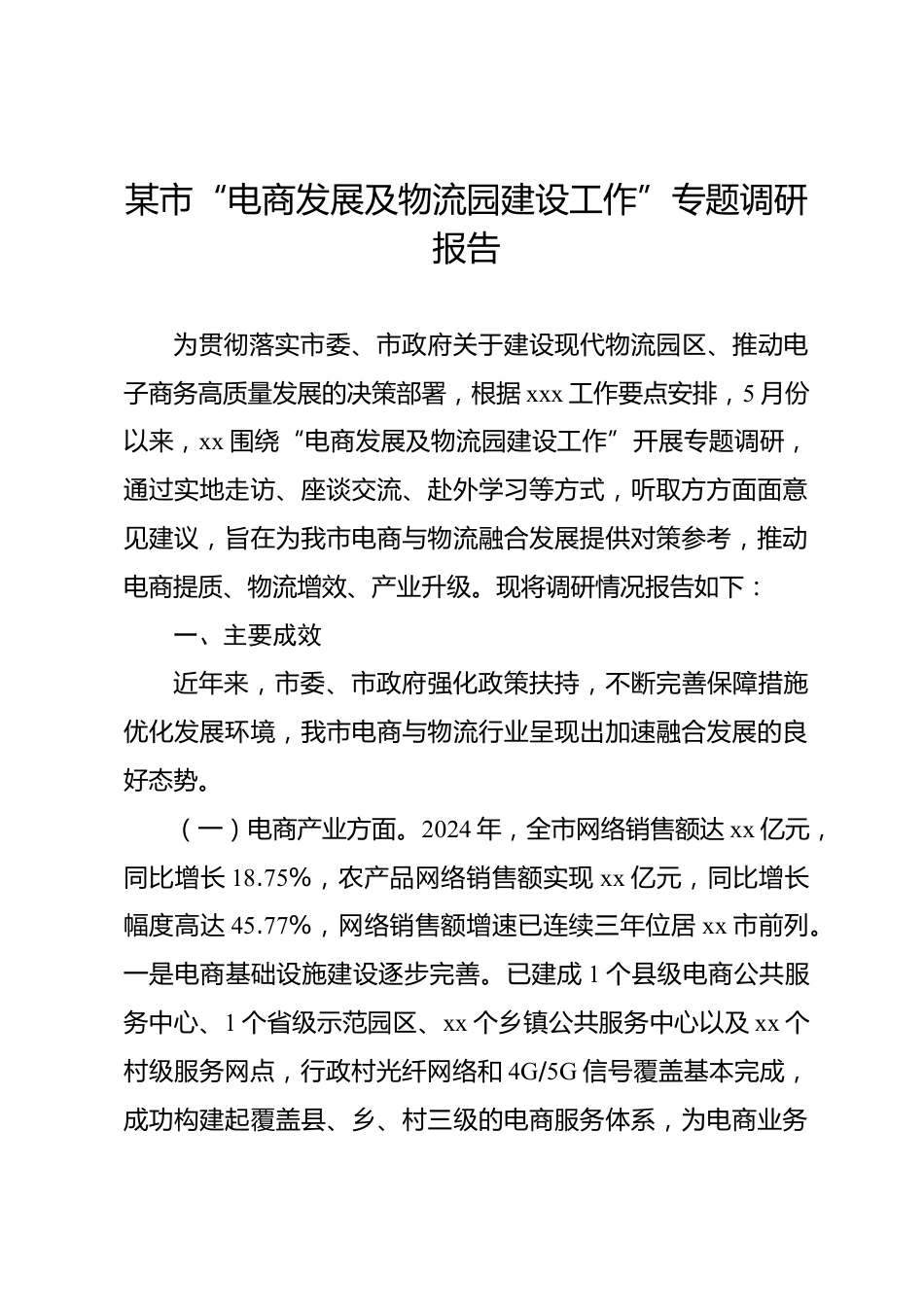 某市“電商發(fā)展及物流園建設(shè)工作”專題調(diào)研報(bào)告為貫徹落實(shí)市委、市政府關(guān)于建設(shè)現(xiàn)代物流園區(qū)、推動(dòng)電子商務(wù)高質(zhì)量發(fā)展的決策部署,根據(jù)xxx工作要點(diǎn)安排,5月份以來,xx圍繞“電商發(fā)展及物流園建設(shè)工作”開展專題調(diào)研,通過實(shí)地走訪、座談交流、赴外學(xué)習(xí)等方式,聽取方方面面意見建議,旨在為我市電商與物流融合發(fā)展提供對(duì)策參考,推動(dòng)電商提質(zhì)、物流增效、產(chǎn)業(yè)升級(jí)?,F(xiàn)將調(diào)研情況報(bào)告如下:一、主要成效近年來,市委、市政府強(qiáng)化政策扶持,不斷完善保障措施優(yōu)化發(fā)展環(huán)境,我市電商與物流行業(yè)呈現(xiàn)出加速融合發(fā)展的良好態(tài)勢(shì)。(一)電商產(chǎn)業(yè)方面。2024年,全市網(wǎng)絡(luò)銷售額達(dá)...