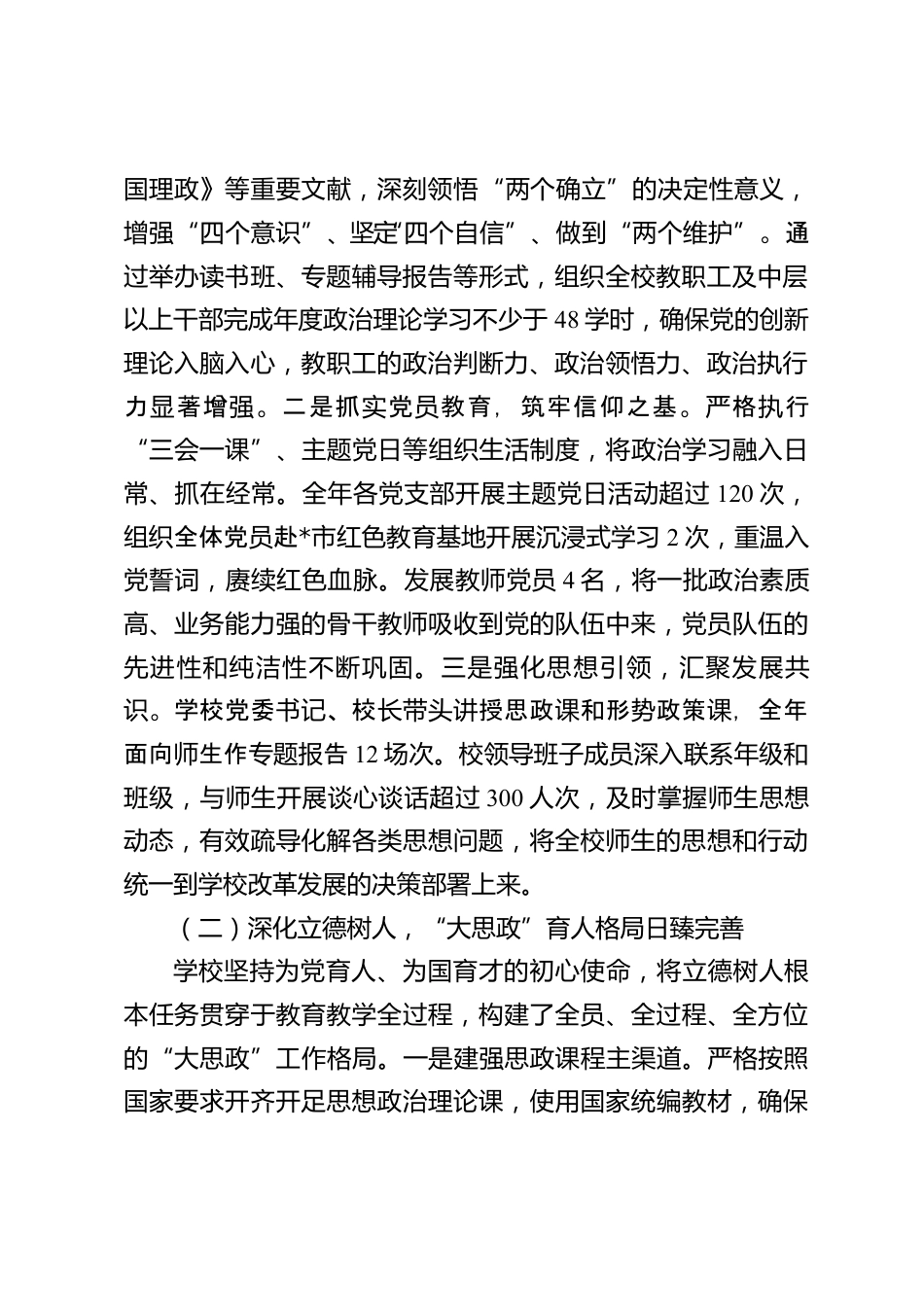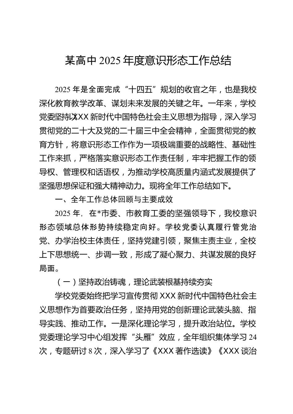 某高中2025年度意識形態(tài)工作總結(jié)2025年是全面完成“十四五”規(guī)劃的收官之年,也是我校深化教育教學(xué)改革、謀劃未來發(fā)展的關(guān)鍵之年。一年來,學(xué)校黨委堅持以XXX新時代中國特色社會主義思想為指導(dǎo),深入學(xué)習貫徹黨的二十大及黨的二十屆三中全會精神,全面貫徹黨的教育方針,將意識形態(tài)工作作為一項極端重要的戰(zhàn)略性、基礎(chǔ)性工作來抓,嚴格落實意識形態(tài)工作責任制,牢牢把握工作的領(lǐng)導(dǎo)權(quán)、管理權(quán)和話語權(quán),為推動學(xué)校高質(zhì)量內(nèi)涵式發(fā)展提供了堅強思想保證和強大精神動力。現(xiàn)將全年工作總結(jié)如下。一、全年工作總體回顧與主要成效2025年,在*市委、市教育工委的堅強領(lǐng)導(dǎo)下,我校...
