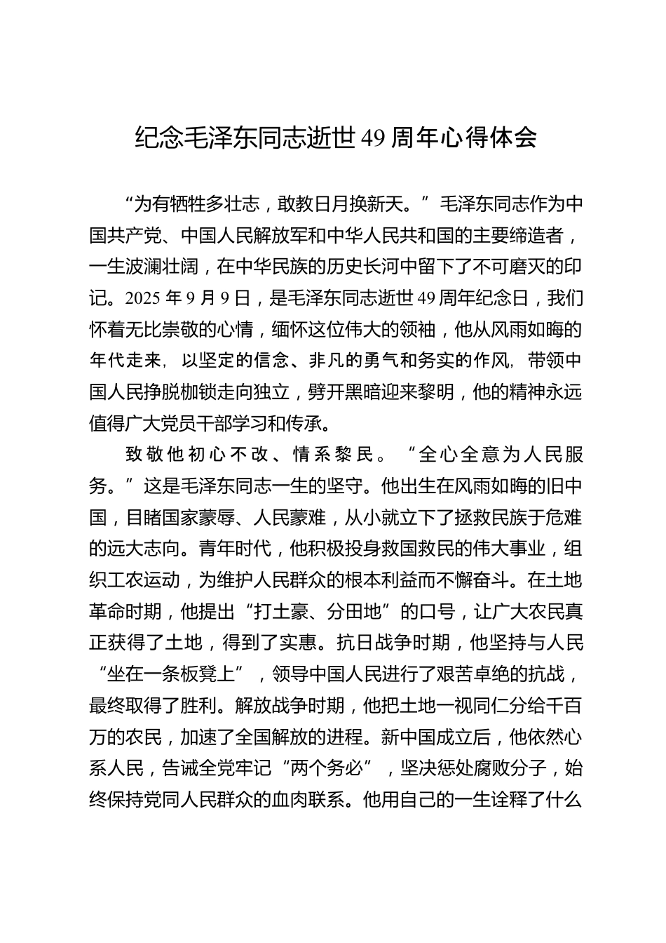 紀(jì)念毛澤東同志逝世49周年心得體會