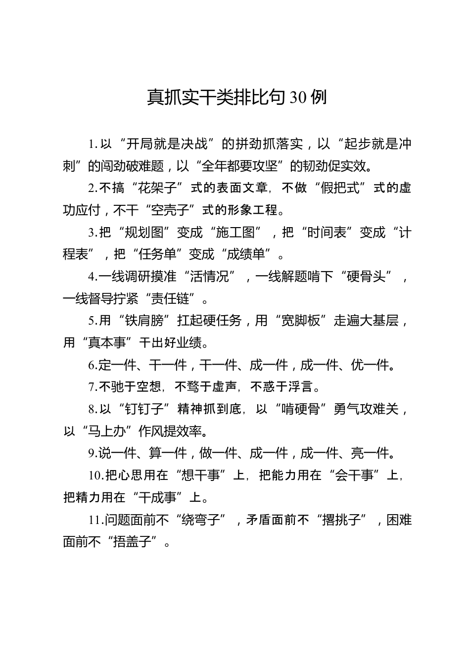 真抓實(shí)干類(lèi)排比句30例1.以“開(kāi)局就是決戰(zhàn)”的拼勁抓落實(shí),以“起步就是沖刺”的闖勁破難題,以“全年都要攻堅(jiān)”的韌勁促實(shí)效。2.不搞“花架子”式的表面文章,不做“假把式”式的虛功應(yīng)付,不干“空殼子”式的形象工程。3.把“規(guī)劃圖”變成“施工圖”,把“時(shí)間表”變成“計(jì)程表”,把“任務(wù)單”變成“成績(jī)單”。4.一線調(diào)研摸準(zhǔn)“活情況”,一線解題啃下“硬骨頭”,一線督導(dǎo)擰緊“責(zé)任鏈”。5.用“鐵肩膀”扛起硬任務(wù),用“寬腳板”走遍大基層,用“真本事”干出好。業(yè)績(jī)6.定一件、干一件,干一件、成一件,成一件、優(yōu)一件。7.不于空想,不于虛聲,不惑于浮言。馳騖8.以...