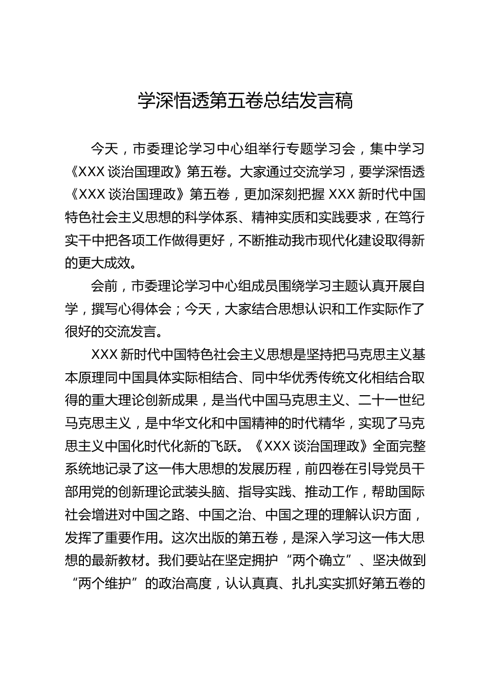 學(xué)深悟透第五卷總結(jié)發(fā)言稿今天,市委理論學(xué)習(xí)中心組舉行專題學(xué)習(xí)會(huì),集中學(xué)習(xí)《XXX談治國(guó)理政》第五卷。大家通過(guò)交流學(xué)習(xí),要學(xué)深悟透《XXX談治國(guó)理政》第五卷,更加深刻把握XXX新時(shí)代中國(guó)特色社會(huì)主義思想的科學(xué)體系、精神實(shí)質(zhì)和實(shí)踐要求,在篤行實(shí)干中把各項(xiàng)工作做得更好,不斷推動(dòng)我市現(xiàn)代化建設(shè)取得新的更大成效。會(huì)前,市委理論學(xué)習(xí)中心組成員圍繞學(xué)習(xí)主題認(rèn)真開展自學(xué),撰寫心得體會(huì);今天,大家結(jié)合思想認(rèn)識(shí)和工作實(shí)際作了很好的交流發(fā)言。XXX新時(shí)代中國(guó)特色社會(huì)主義思想是堅(jiān)持把馬克思主義基本原理同中國(guó)具體實(shí)際相結(jié)合、同中華優(yōu)秀傳統(tǒng)文化相結(jié)合取得的重大理論...