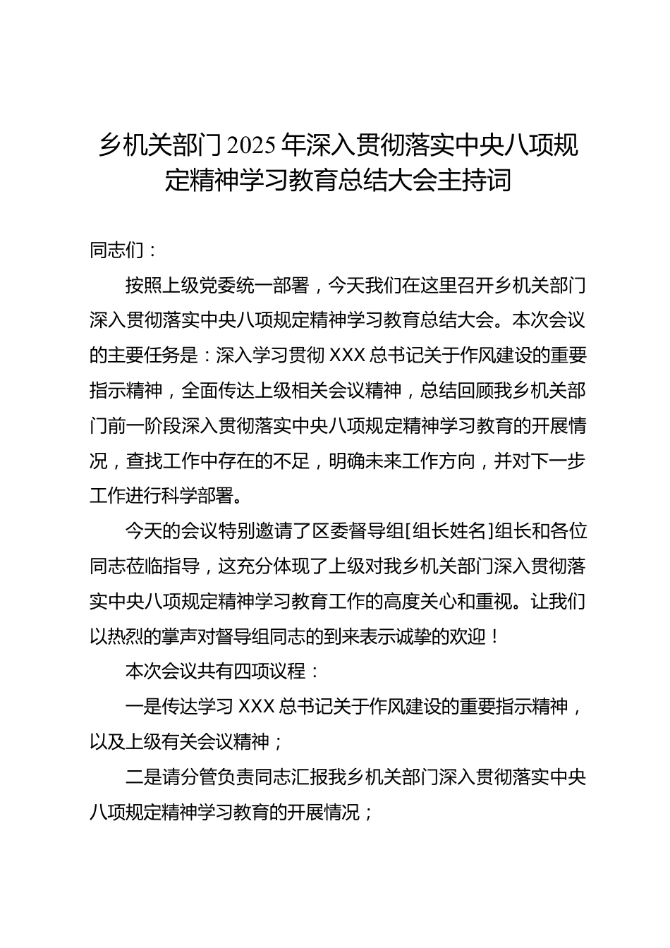 鄉(xiāng)機(jī)關(guān)部門 2025 年深入貫徹落實(shí)中央八項(xiàng)規(guī)定精神學(xué)習(xí)教育總結(jié)大會(huì)主持詞