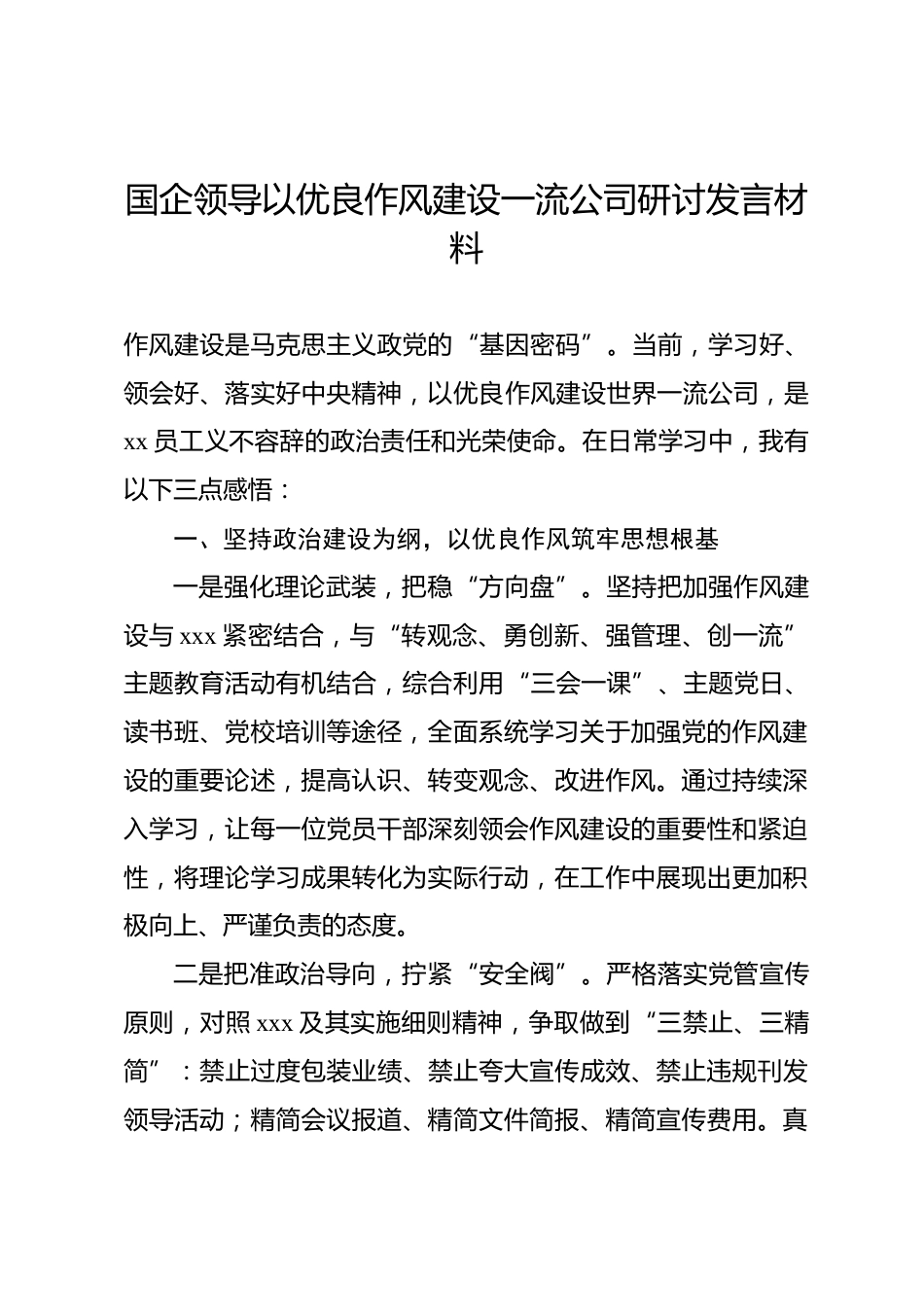 國(guó)企領(lǐng)導(dǎo)以優(yōu)良作風(fēng)建設(shè)一流公司研討發(fā)言材料