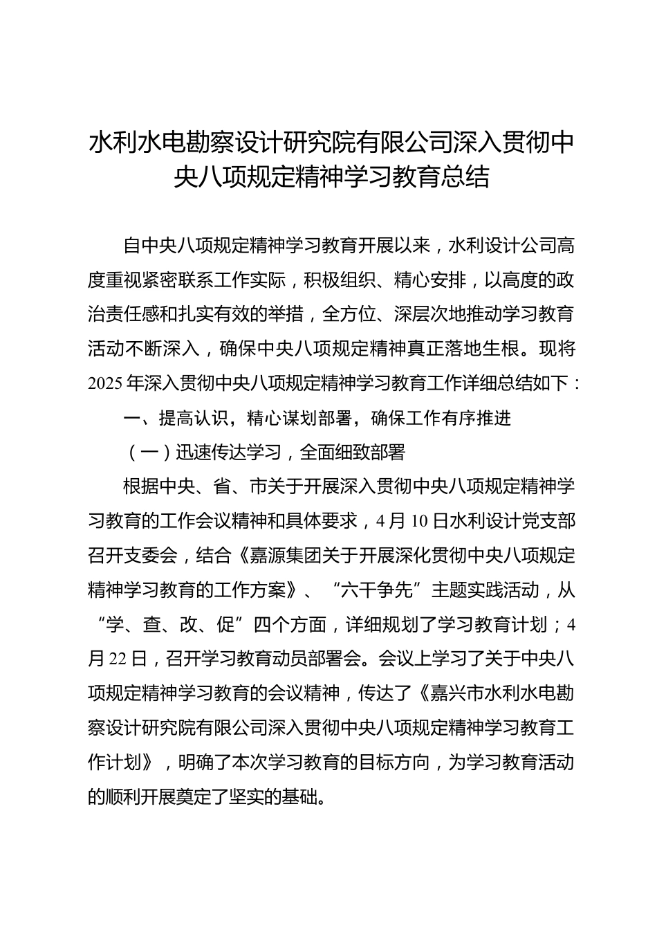 水利水電勘察設(shè)計(jì)研究院有限公司深入貫徹中央八項(xiàng)規(guī)定精神學(xué)習(xí)教育總結(jié)自中央八項(xiàng)規(guī)定精神學(xué)習(xí)教育開展以來,水利設(shè)計(jì)公司高度重視緊密聯(lián)系工作實(shí)際,積極組織、精心安排,以高度的政治責(zé)任感和扎實(shí)有效的舉措,全方位、深層次地推動學(xué)習(xí)教育活動不斷深入,確保中央八項(xiàng)規(guī)定精神真正落地生根?,F(xiàn)將2025年深入貫徹中央八項(xiàng)規(guī)定精神學(xué)習(xí)教育工作詳細(xì)總結(jié)如下:一、提高認(rèn)識,精心謀劃部署,確保工作有序推進(jìn)(一)迅速傳達(dá)學(xué)習(xí),全面細(xì)致部署根據(jù)中央、省、市關(guān)于開展深入貫徹中央八項(xiàng)規(guī)定精神學(xué)習(xí)教育的工作會議精神和具體要求,4月10日水利設(shè)計(jì)黨支部召開支委會,結(jié)合《...