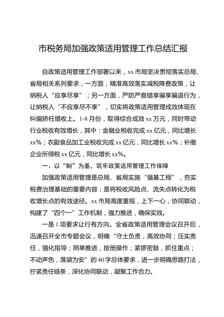 市稅務局加強政策適用管理工作總結(jié)匯報自政策適用管理工作部署以來,xx市局堅決貫徹落實總局、省局相關(guān)系列要求,一方面,精準高效落實減稅降費政策,讓納稅人“應享盡享”;另一方面,嚴防嚴查錯享騙享騙退行為,讓納稅人“不應享盡不享”,切實將政策適用管理成效體現(xiàn)在糾偏矯枉增收上。1-8月份,取得綜合成效xx萬元,同時帶動行業(yè)稅收有效增長,其中:金融業(yè)稅收完成xx億元,同比增長xx%;農(nóng)副食品加工業(yè)稅收完成xx億元,同比增長xx%;補繳企業(yè)所得稅xx億元,同比增長xx%。一、以“制”為基,筑牢政策適用管理工作保障加強政策適用管理是總局、省局實施“強基工程”,...