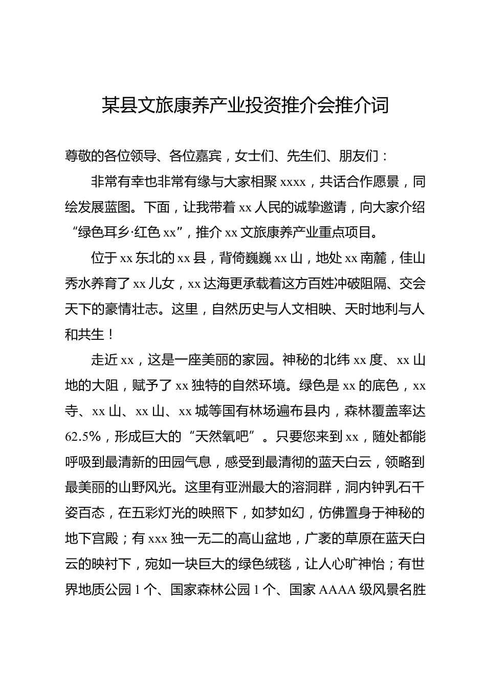 某縣文旅康養(yǎng)產(chǎn)業(yè)投資推介會推介詞尊敬的各位領(lǐng)導(dǎo)、各位嘉賓,女士們、先生們、朋友們:非常有幸也非常有緣與大家相聚xxxx,共話合作愿景,同繪發(fā)展藍圖。下面,讓我?guī)е鴛x人民的誠摯邀請,向大家介紹“綠色耳鄉(xiāng)·紅色xx”,推介xx文旅康養(yǎng)產(chǎn)業(yè)重點項目。位于xx東北的xx縣,背倚巍巍xx山,地處xx南麓,佳山秀水養(yǎng)育了xx兒女,xx達海更承載著這方百姓沖破阻隔、交會天下的豪情壯志。這里,自然歷史與人文相映、天時地利與人和共生!走近xx,這是一座美麗的家園。神秘的北緯xx度、xx山地的大阻,賦予了xx獨特的自然環(huán)境。綠色是xx的底色,xx寺、xx山、xx山、xx城等國有林場...