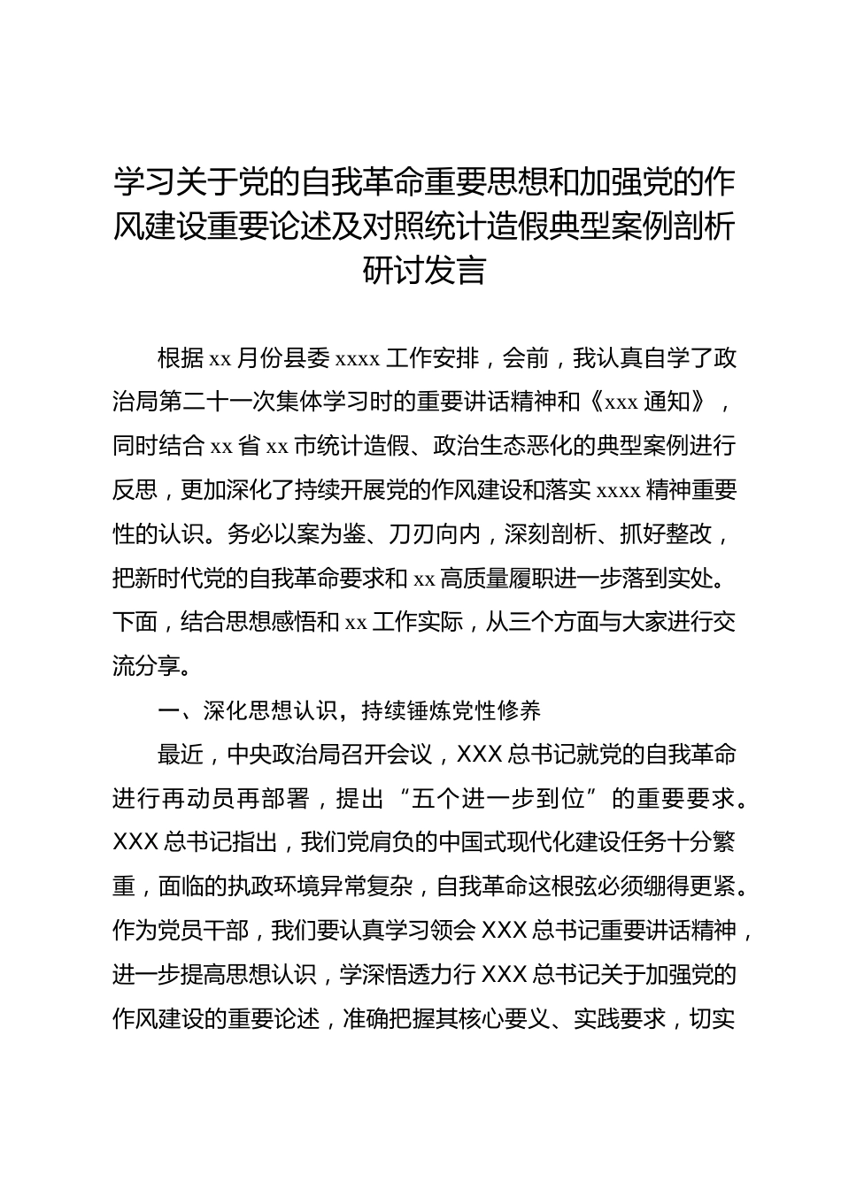 學(xué)習(xí)關(guān)于黨的自我革命重要思想和加強(qiáng)黨的作風(fēng)建設(shè)重要論述及對(duì)照統(tǒng)計(jì)造假典型案例剖析研討發(fā)言根據(jù)xx月份縣委xxxx工作安排,會(huì)前,我認(rèn)真自學(xué)了政治局第二十一次集體學(xué)習(xí)時(shí)的重要講話(huà)精神和《xxx通知》,同時(shí)結(jié)合x(chóng)x省xx市統(tǒng)計(jì)造假、政治生態(tài)惡化的典型案例進(jìn)行反思,更加深化了持續(xù)開(kāi)展黨的作風(fēng)建設(shè)和落實(shí)xxxx精神重要性的認(rèn)識(shí)。務(wù)必以案為鑒、刀刃向內(nèi),深刻剖析、抓好整改,把新時(shí)代黨的自我革命要求和xx高質(zhì)量履職進(jìn)一步落到實(shí)處。下面,結(jié)合思想感悟和xx工作實(shí)際,從三個(gè)方面與大家進(jìn)行交流分享。一、深化思想認(rèn)識(shí),持續(xù)錘煉黨性修養(yǎng)最近,中央政治局召開(kāi)會(huì)議,XXX總...