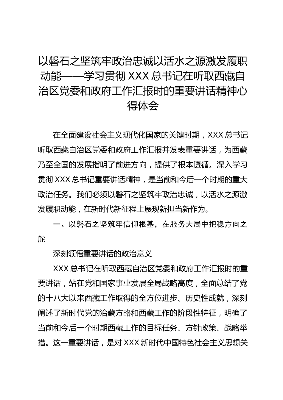 以磐石之堅(jiān)筑牢政治忠誠(chéng)以活水之源激發(fā)履職動(dòng)能——學(xué)習(xí)貫徹XXX總書(shū)記在聽(tīng)取西藏自治區(qū)黨委和政府工作匯報(bào)時(shí)的重要講話精神心得體會(huì)在全面建設(shè)社會(huì)主義現(xiàn)代化國(guó)家的關(guān)鍵時(shí)期,XXX總書(shū)記聽(tīng)取西藏自治區(qū)黨委和政府工作匯報(bào)并發(fā)表重要講話,為西藏乃至全國(guó)的發(fā)展指明了前進(jìn)方向,提供了根本遵循。深入學(xué)習(xí)貫徹XXX總書(shū)記重要講話精神,是當(dāng)前和今后一個(gè)時(shí)期的重大政治任務(wù)。我們必須以磐石之堅(jiān)筑牢政治忠誠(chéng),以活水之源激發(fā)履職動(dòng)能,在新時(shí)代新征程上展現(xiàn)新?lián)?dāng)新作為。一、以磐石之堅(jiān)筑牢信仰根基,在服務(wù)大局中把穩(wěn)方向之舵深刻領(lǐng)悟重要講話的政治意義XXX總書(shū)記在聽(tīng)取西藏...