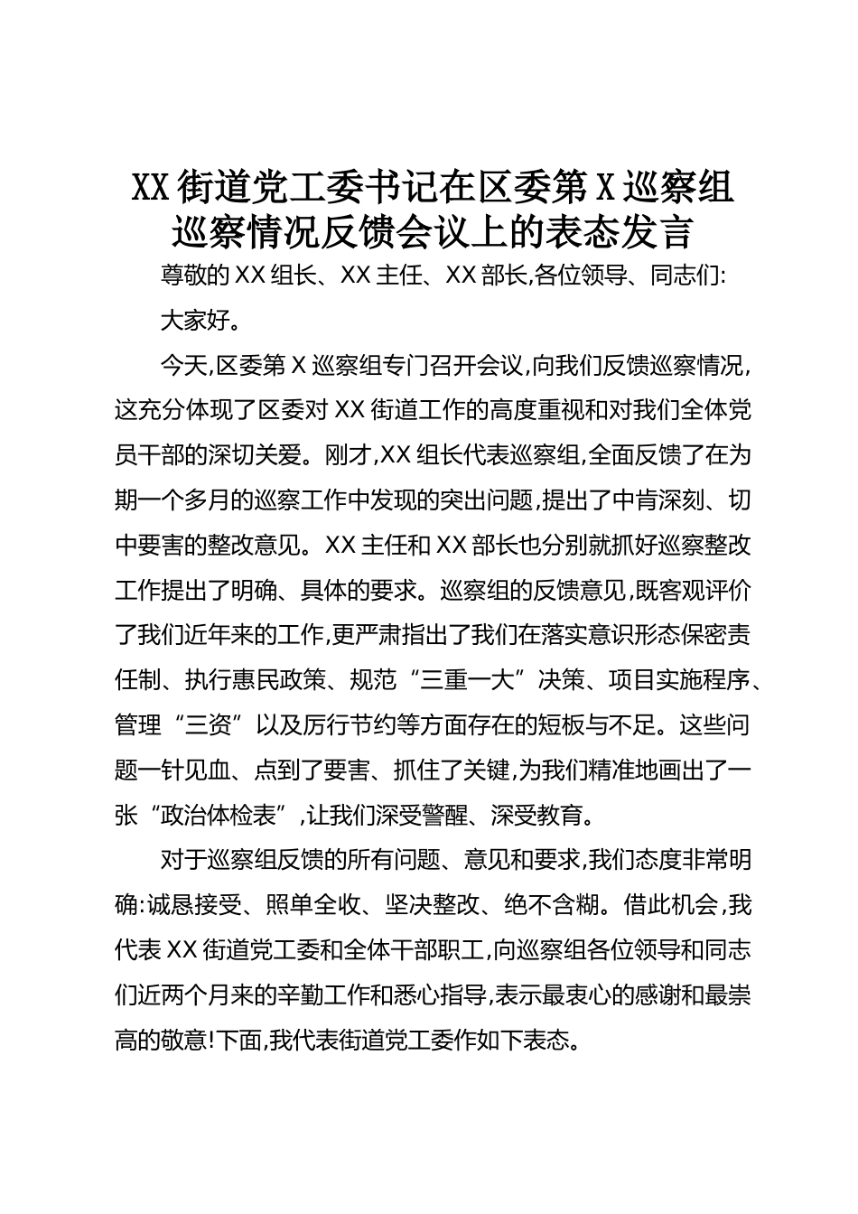 XX街道黨工委書記在區(qū)委第X巡察組巡察情況反饋會議上的表態(tài)發(fā)言
