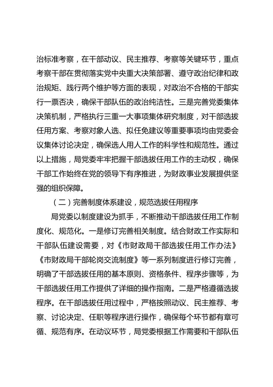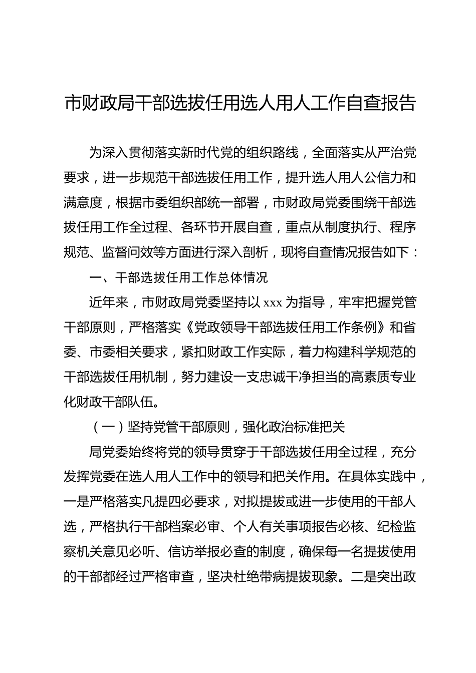 市財政局干部選拔任用選人用人工作自查報告為深入貫徹落實新時代黨的組織路線,全面落實從嚴治黨要求,進一步規(guī)范干部選拔任用工作,提升選人用人公信力和滿意度,根據(jù)市委組織部統(tǒng)一部署,市財政局黨委圍繞干部選拔任用工作全過程、各環(huán)節(jié)開展自查,重點從制度執(zhí)行、程序規(guī)范、監(jiān)督問效等方面進行深入剖析,現(xiàn)將自查情況報告如下:一、干部選拔任用工作總體情況近年來,市財政局黨委堅持以xxx為指導(dǎo),牢牢把握黨管干部原則,嚴格落實《黨政領(lǐng)導(dǎo)干部選拔任用工作條例》和省委、市委相關(guān)要求,緊扣財政工作實際,著力構(gòu)建科學(xué)規(guī)范的干部選拔任用機制,努力建設(shè)一支忠誠干...