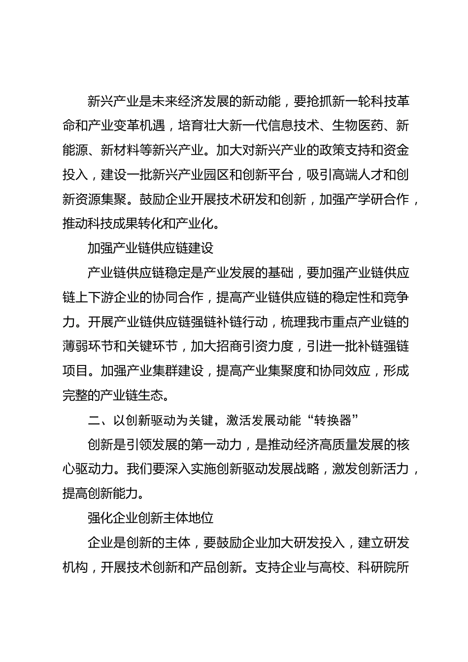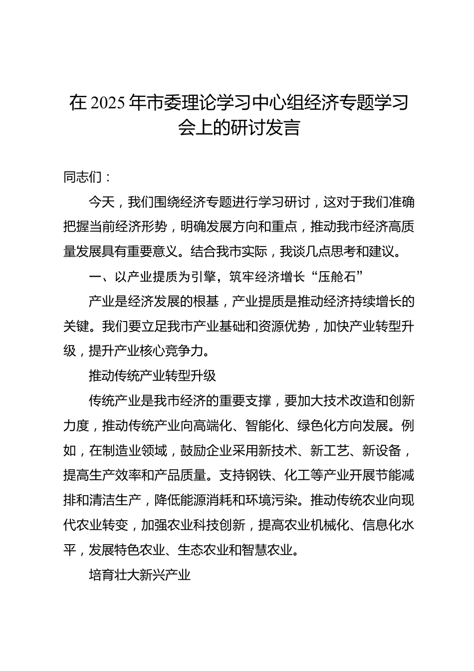 在2025年市委理論學(xué)習(xí)中心組經(jīng)濟(jì)專題學(xué)習(xí)會(huì)上的研討發(fā)言同志們:今天,我們圍繞經(jīng)濟(jì)專題進(jìn)行學(xué)習(xí)研討,這對(duì)于我們準(zhǔn)確把握當(dāng)前經(jīng)濟(jì)形勢(shì),明確發(fā)展方向和重點(diǎn),推動(dòng)我市經(jīng)濟(jì)高質(zhì)量發(fā)展具有重要意義。結(jié)合我市實(shí)際,我談幾點(diǎn)思考和建議。一、以產(chǎn)業(yè)提質(zhì)為引擎,筑牢經(jīng)濟(jì)增長(zhǎng)“壓艙石”產(chǎn)業(yè)是經(jīng)濟(jì)發(fā)展的根基,產(chǎn)業(yè)提質(zhì)是推動(dòng)經(jīng)濟(jì)持續(xù)增長(zhǎng)的關(guān)鍵。我們要立足我市產(chǎn)業(yè)基礎(chǔ)和資源優(yōu)勢(shì),加快產(chǎn)業(yè)轉(zhuǎn)型升級(jí),提升產(chǎn)業(yè)核心競(jìng)爭(zhēng)力。推動(dòng)傳統(tǒng)產(chǎn)業(yè)轉(zhuǎn)型升級(jí)傳統(tǒng)產(chǎn)業(yè)是我市經(jīng)濟(jì)的重要支撐,要加大技術(shù)改造和創(chuàng)新力度,推動(dòng)傳統(tǒng)產(chǎn)業(yè)向高端化、智能化、綠色化方向發(fā)展。例如,在制造業(yè)領(lǐng)域...