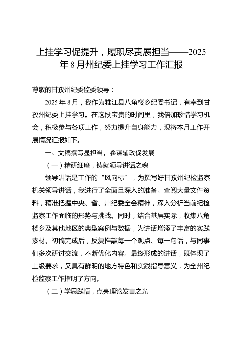 上掛學(xué)習(xí)促提升,履職盡責(zé)展擔(dān)當(dāng)——2025年8月州紀(jì)委上掛學(xué)習(xí)工作匯報(bào)尊敬的甘孜州紀(jì)委監(jiān)委領(lǐng)導(dǎo):2025年8月,我作為雅江縣八角樓鄉(xiāng)紀(jì)委書(shū)記,有幸到甘孜州紀(jì)委上掛學(xué)習(xí)。在這段寶貴的時(shí)間里,我倍加珍惜學(xué)習(xí)機(jī)會(huì),積極參與各項(xiàng)工作,努力提升自身能力,現(xiàn)將本月工作開(kāi)展情況匯報(bào)如下。一、文稿撰寫(xiě)顯擔(dān)當(dāng),參謀輔政促發(fā)展(一)精研細(xì)磨,鑄就領(lǐng)導(dǎo)講話之魂領(lǐng)導(dǎo)講話是工作的“風(fēng)向標(biāo)”,為撰寫(xiě)好甘孜州紀(jì)檢監(jiān)察機(jī)關(guān)領(lǐng)導(dǎo)講話,我進(jìn)行了全面且深入的準(zhǔn)備。查閱大量文件資料,精準(zhǔn)把握中央、省、州紀(jì)委全會(huì)精神,深入分析當(dāng)前紀(jì)檢監(jiān)察工作面臨的形勢(shì)與挑戰(zhàn)。同時(shí),結(jié)合基層實(shí)...