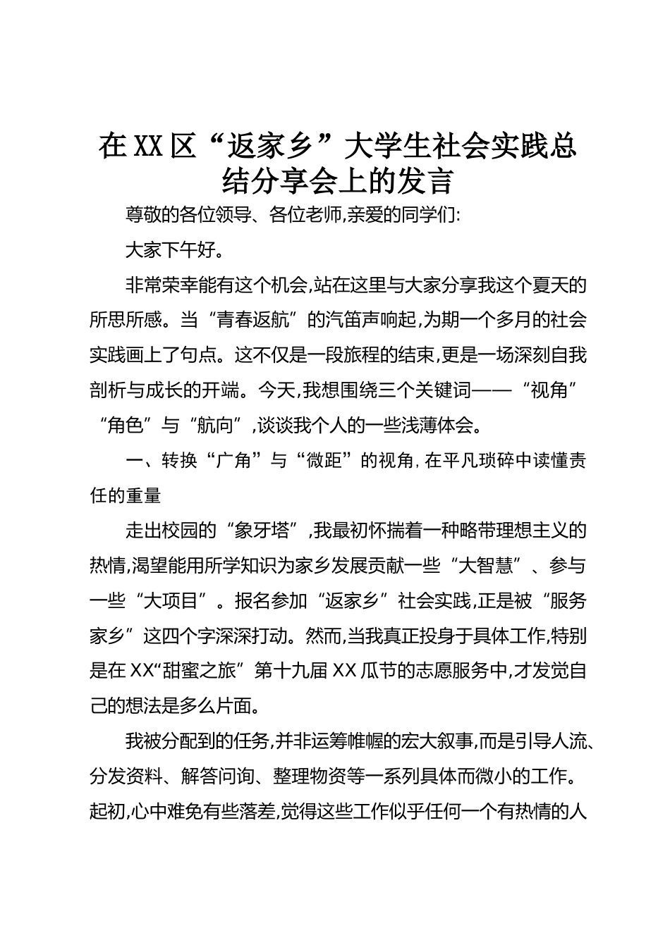 在XX區(qū)“返家鄉(xiāng)”大學(xué)生社會實(shí)踐總結(jié)分享會上的發(fā)言
