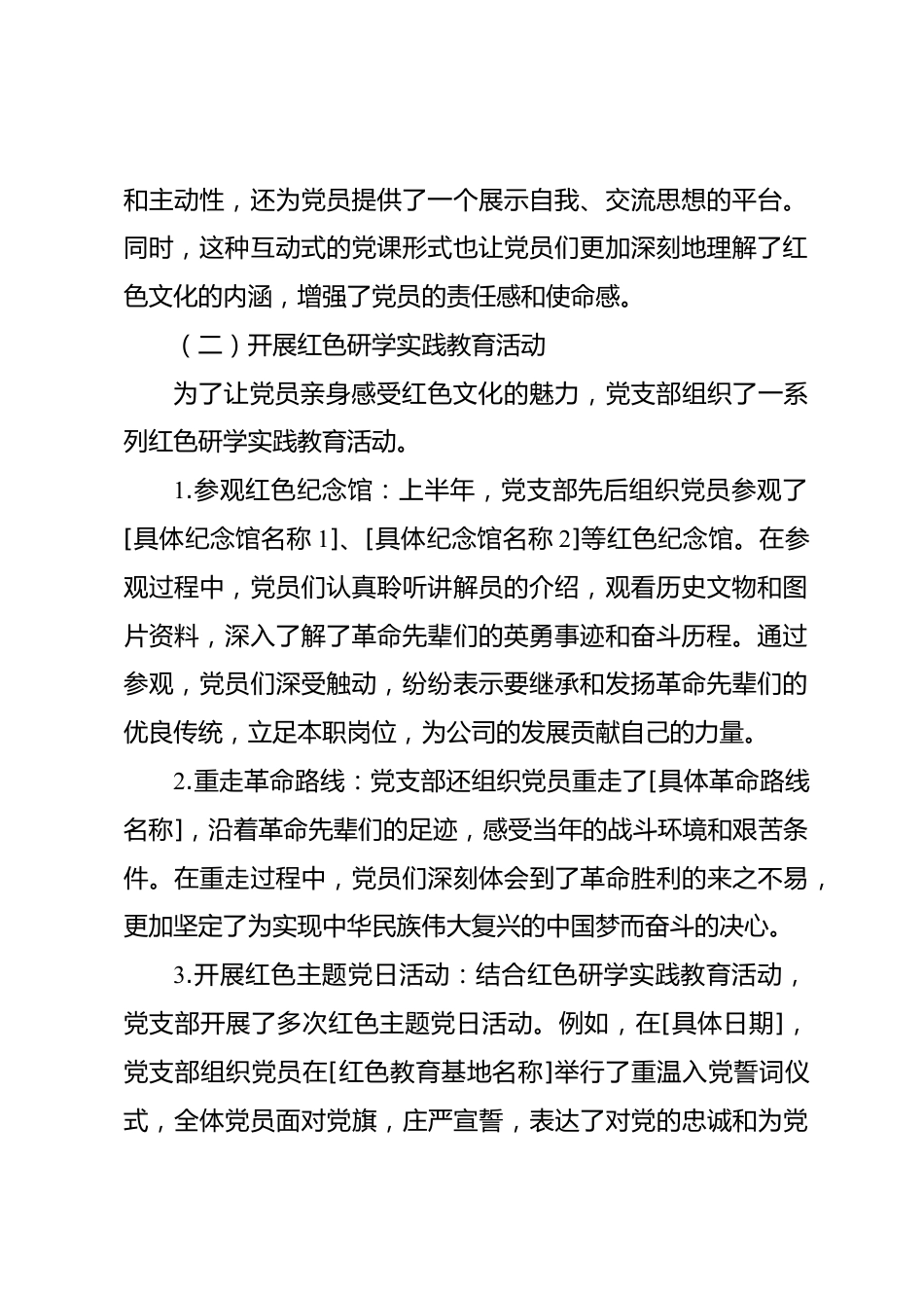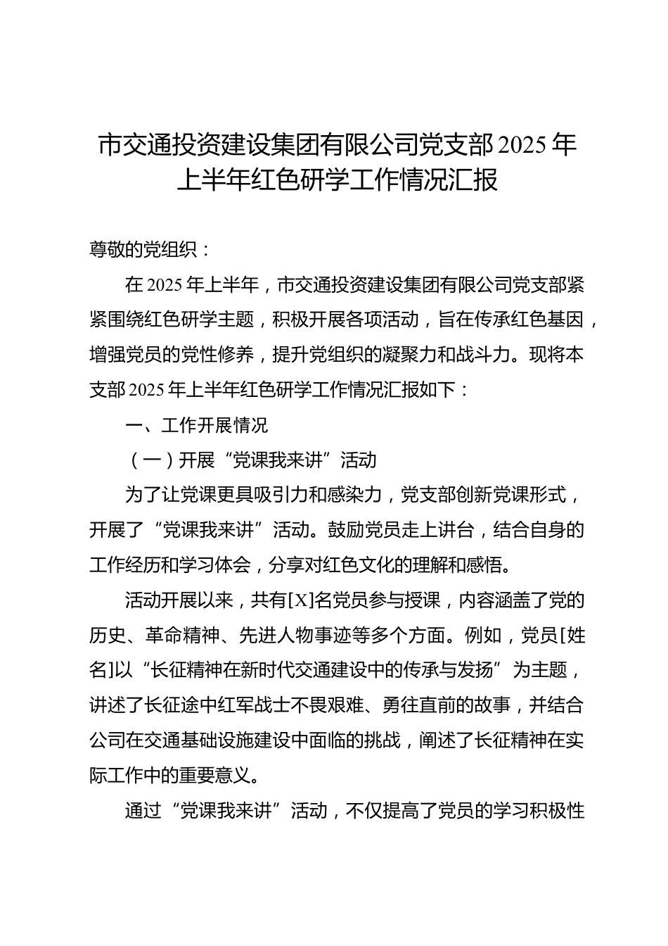 市交通投資建設(shè)集團(tuán)有限公司黨支部2025年上半年紅色研學(xué)工作情況匯報(bào)尊敬的黨組織:在2025年上半年,市交通投資建設(shè)集團(tuán)有限公司黨支部緊緊圍繞紅色研學(xué)主題,積極開展各項(xiàng)活動(dòng),旨在傳承紅色基因,增強(qiáng)黨員的黨性修養(yǎng),提升黨組織的凝聚力和戰(zhàn)斗力。現(xiàn)將本支部2025年上半年紅色研學(xué)工作情況匯報(bào)如下:一、工作開展情況(一)開展“黨課我來講”活動(dòng)為了讓黨課更具吸引力和感染力,黨支部創(chuàng)新黨課形式,開展了“黨課我來講”活動(dòng)。鼓勵(lì)黨員走上講臺(tái),結(jié)合自身的工作經(jīng)歷和學(xué)習(xí)體會(huì),分享對(duì)紅色文化的理解和感悟?;顒?dòng)開展以來,共有[X]名黨員參與授課,內(nèi)容涵蓋了黨的歷...