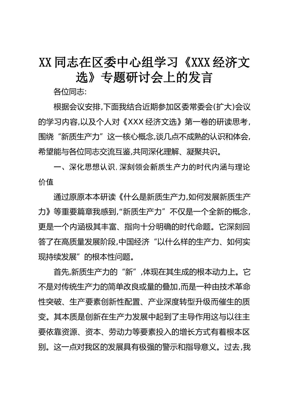 XX同志在區(qū)委中心組學習《XXX經(jīng)濟文選》專題研討會上的發(fā)言各位同志:根據(jù)會議安排,下面我結(jié)合近期參加區(qū)委常委會(擴大)會議的學習內(nèi)容,以及個人對《XXX經(jīng)濟文選》第一卷的研讀思考,圍繞“新質(zhì)生產(chǎn)力”這一核心概念,談幾點不成熟的認識和體會,希望能與各位同志交流互鑒,共同深化理解、凝聚共識。一、深化思想認識,深刻領(lǐng)會新質(zhì)生產(chǎn)力的時代內(nèi)涵與理論價值通過原原本本研讀《什么是新質(zhì)生產(chǎn)力,如何發(fā)展新質(zhì)生產(chǎn)力》等重要篇章我感到,“新質(zhì)生產(chǎn)力”不僅是一個全新的概念,更是一個內(nèi)涵極其豐富、指向十分明確的時代命題。它深刻回答了在高質(zhì)量發(fā)展階段,中國經(jīng)濟“以什么樣的...