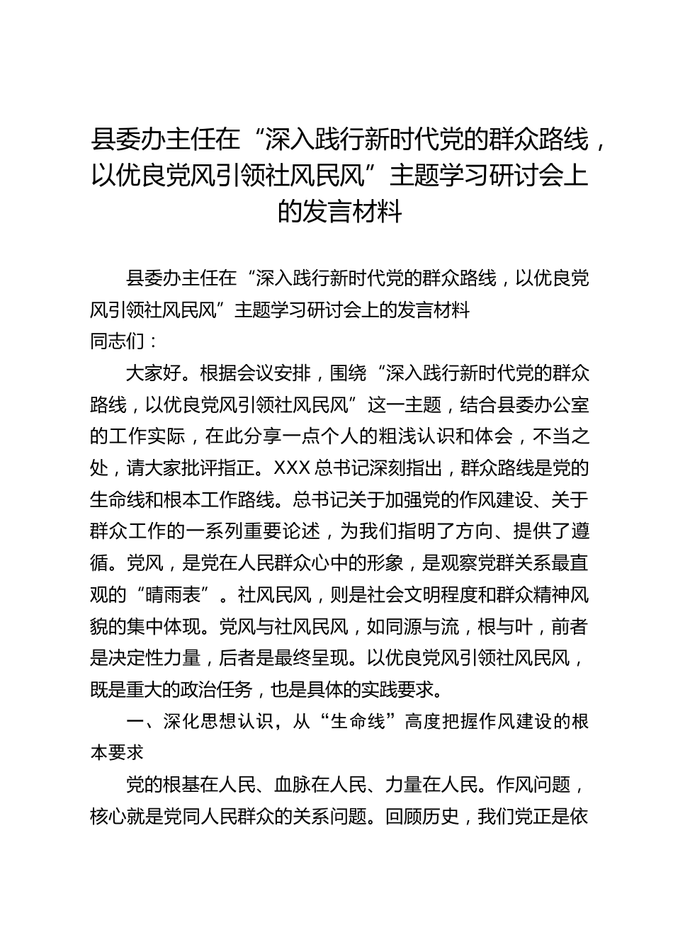 縣委辦主任在“深入踐行新時代黨的群眾路線,以優(yōu)良黨風引領社風民風”主題學習研討會上的發(fā)言材料縣委辦主任在“深入踐行新時代黨的群眾路線,以優(yōu)良黨風引領社風民風”主題學習研討會上的發(fā)言材料同志們:大家好。根據(jù)會議安排,圍繞“深入踐行新時代黨的群眾路線,以優(yōu)良黨風引領社風民風”這一主題,結合縣委辦公室的工作實際,在此分享一點個人的粗淺認識和體會,不當之處,請大家批評指正。XXX總書記深刻指出,群眾路線是黨的生命線和根本工作路線。總書記關于加強黨的作風建設、關于群眾工作的一系列重要論述,為我們指明了方向、提供了遵循。黨風,是黨在人民群...