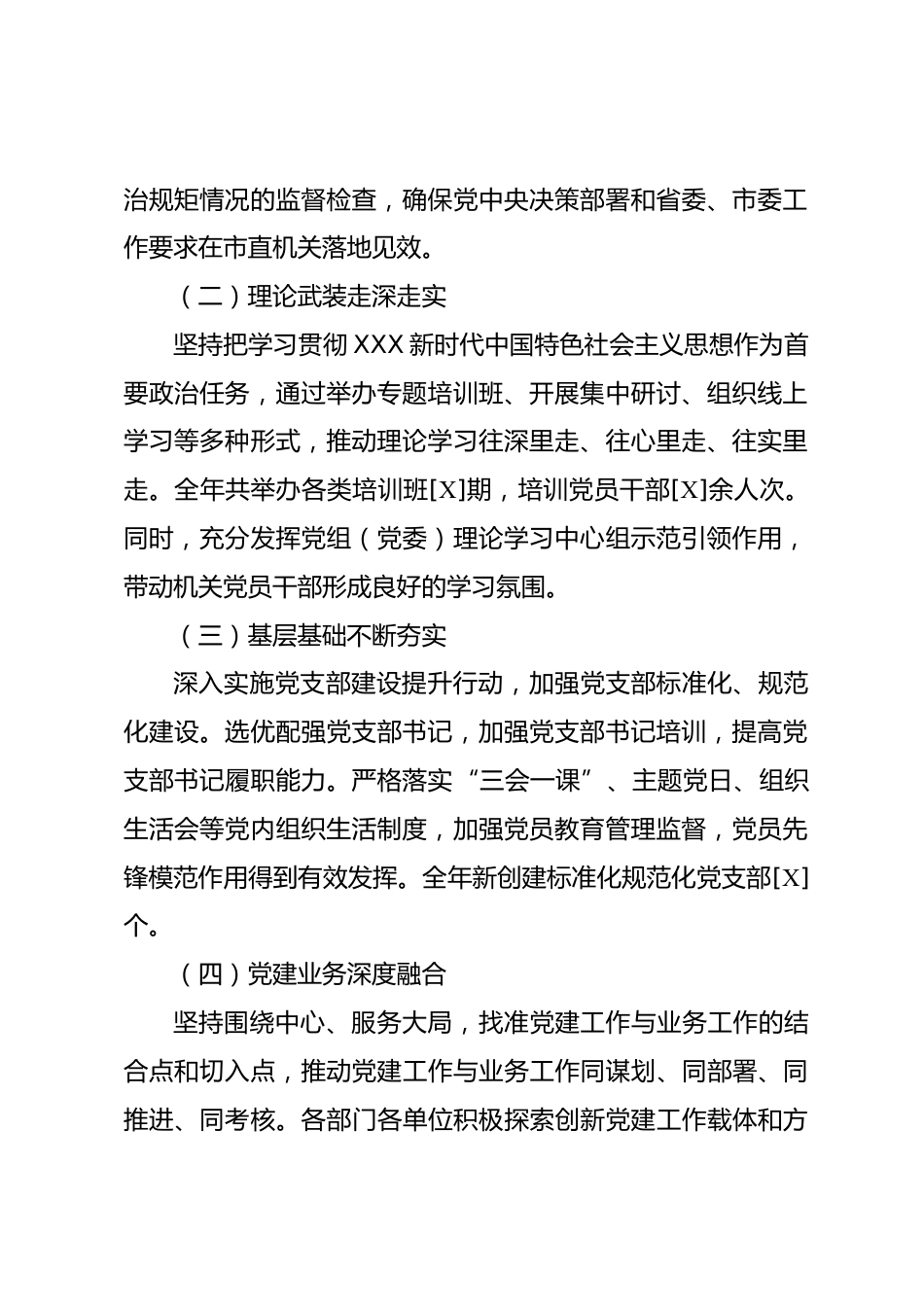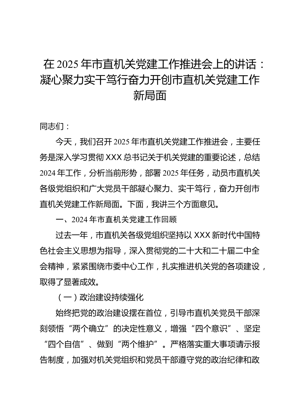 在2025年市直機關(guān)黨建工作推進會上的講話:凝心聚力實干篤行奮力開創(chuàng)市直機關(guān)黨建工作新局面同志們:今天,我們召開2025年市直機關(guān)黨建工作推進會,主要任務(wù)是深入學(xué)習(xí)貫徹XXX總書記關(guān)于機關(guān)黨建的重要論述,總結(jié)2024年工作,分析當(dāng)前形勢,部署2025年任務(wù),動員市直機關(guān)各級黨組織和廣大黨員干部凝心聚力、實干篤行,奮力開創(chuàng)市直機關(guān)黨建工作新局面。下面,我講三個方面意見。一、2024年市直機關(guān)黨建工作回顧過去一年,市直機關(guān)各級黨組織堅持以XXX新時代中國特色社會主義思想為指導(dǎo),深入貫徹黨的二十大和二十屆二中全會精神,緊緊圍繞市委中心工作,扎實推進機關(guān)黨的...
