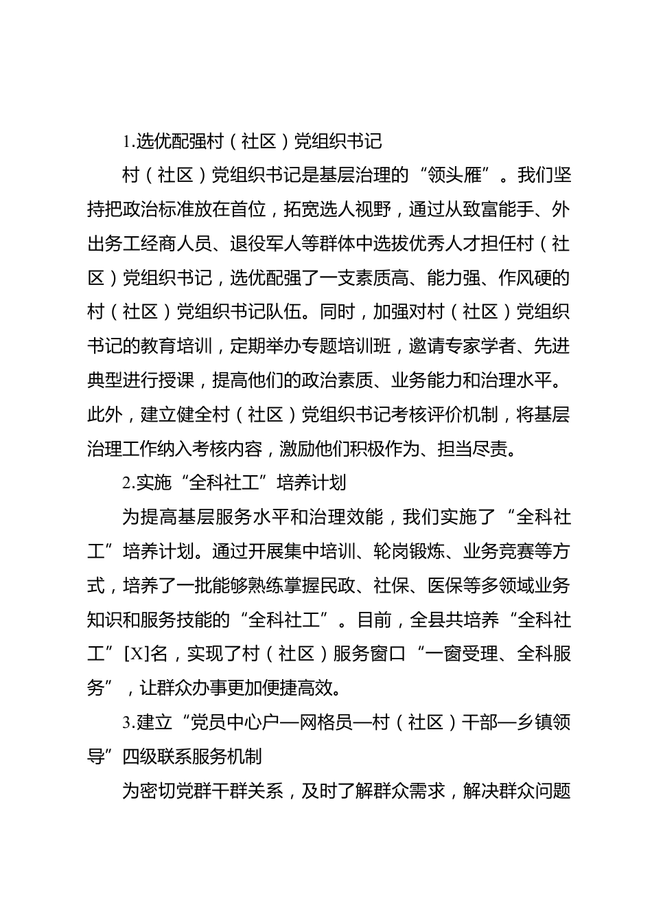 縣委書記在全市黨建引領(lǐng)基層治理創(chuàng)新經(jīng)驗交流會上的發(fā)言尊敬的各位領(lǐng)導(dǎo)、同志們:大家好!很榮幸能在這次全市黨建引領(lǐng)基層治理創(chuàng)新經(jīng)驗交流會上,與大家分享我縣在黨建引領(lǐng)基層治理方面的一些做法和經(jīng)驗。一、堅持黨建統(tǒng)領(lǐng),筑牢基層治理“紅色根基”(一)織密組織網(wǎng)絡(luò),實現(xiàn)“治理末梢”全覆蓋基層治理的難點在于治理末梢的延伸和覆蓋。我縣以黨建為引領(lǐng),不斷織密組織網(wǎng)絡(luò),確保黨的工作在基層無死角。我們按照地域相鄰、便于管理的原則,在農(nóng)村以村民小組、自然村為單元,在城市以小區(qū)、樓棟為單元,建立黨支部或黨小組,構(gòu)建起“鄉(xiāng)鎮(zhèn)黨委—村(社區(qū))黨組織—網(wǎng)格黨...