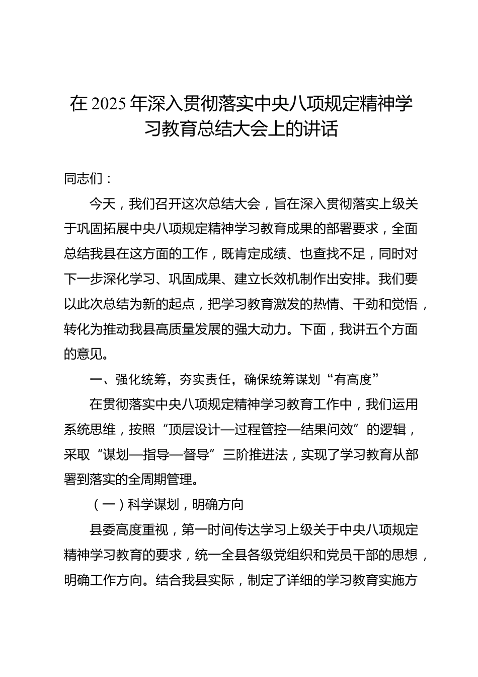 在2025年深入貫徹落實中央八項規(guī)定精神學習教育總結大會上的講話同志們:今天,我們召開這次總結大會,旨在深入貫徹落實上級關于鞏固拓展中央八項規(guī)定精神學習教育成果的部署要求,全面總結我縣在這方面的工作,既肯定成績、也查找不足,同時對下一步深化學習、鞏固成果、建立長效機制作出安排。我們要以此次總結為新的起點,把學習教育激發(fā)的熱情、干勁和覺悟,轉化為推動我縣高質量發(fā)展的強大動力。下面,我講五個方面的意見。一、強化統(tǒng)籌,夯實責任,確保統(tǒng)籌謀劃“有高度”在貫徹落實中央八項規(guī)定精神學習教育工作中,我們運用系統(tǒng)思維,按照“頂層設計—過程管控—...