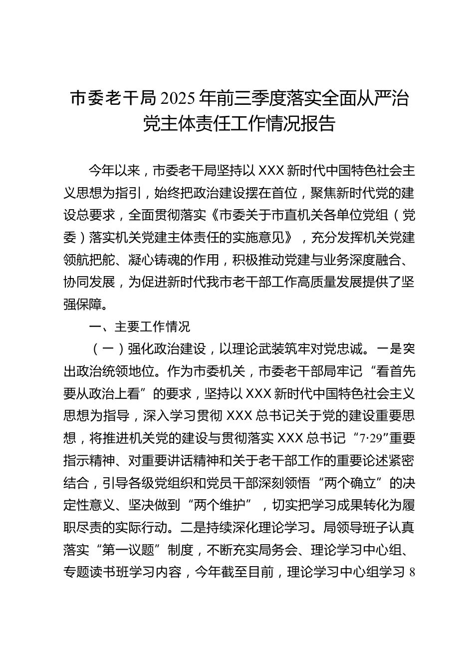 市委老干局2025年前三季度落實(shí)全面從嚴(yán)治黨主體責(zé)任工作情況報(bào)告今年以來,市委老干局堅(jiān)持以XXX新時(shí)代中國(guó)特色社會(huì)主義思想為指引,始終把政治建設(shè)擺在首位,聚焦新時(shí)代黨的建設(shè)總要求,全面貫徹落實(shí)《市委關(guān)于市直機(jī)關(guān)各單位黨組(黨委)落實(shí)機(jī)關(guān)黨建主體責(zé)任的實(shí)施意見》,充分發(fā)揮機(jī)關(guān)黨建領(lǐng)航把舵、凝心鑄魂的作用,積極推動(dòng)黨建與業(yè)務(wù)深度融合、協(xié)同發(fā)展,為促進(jìn)新時(shí)代我市老干部工作高質(zhì)量發(fā)展提供了堅(jiān)強(qiáng)保障。一、主要工作情況(一)強(qiáng)化政治建設(shè),以理論武裝筑牢對(duì)黨忠誠(chéng)。一是突出政治統(tǒng)領(lǐng)地位。作為市委機(jī)關(guān),市委老干部局牢記“看首先要從政治上看”的要求,...