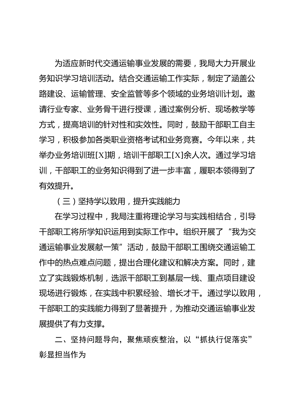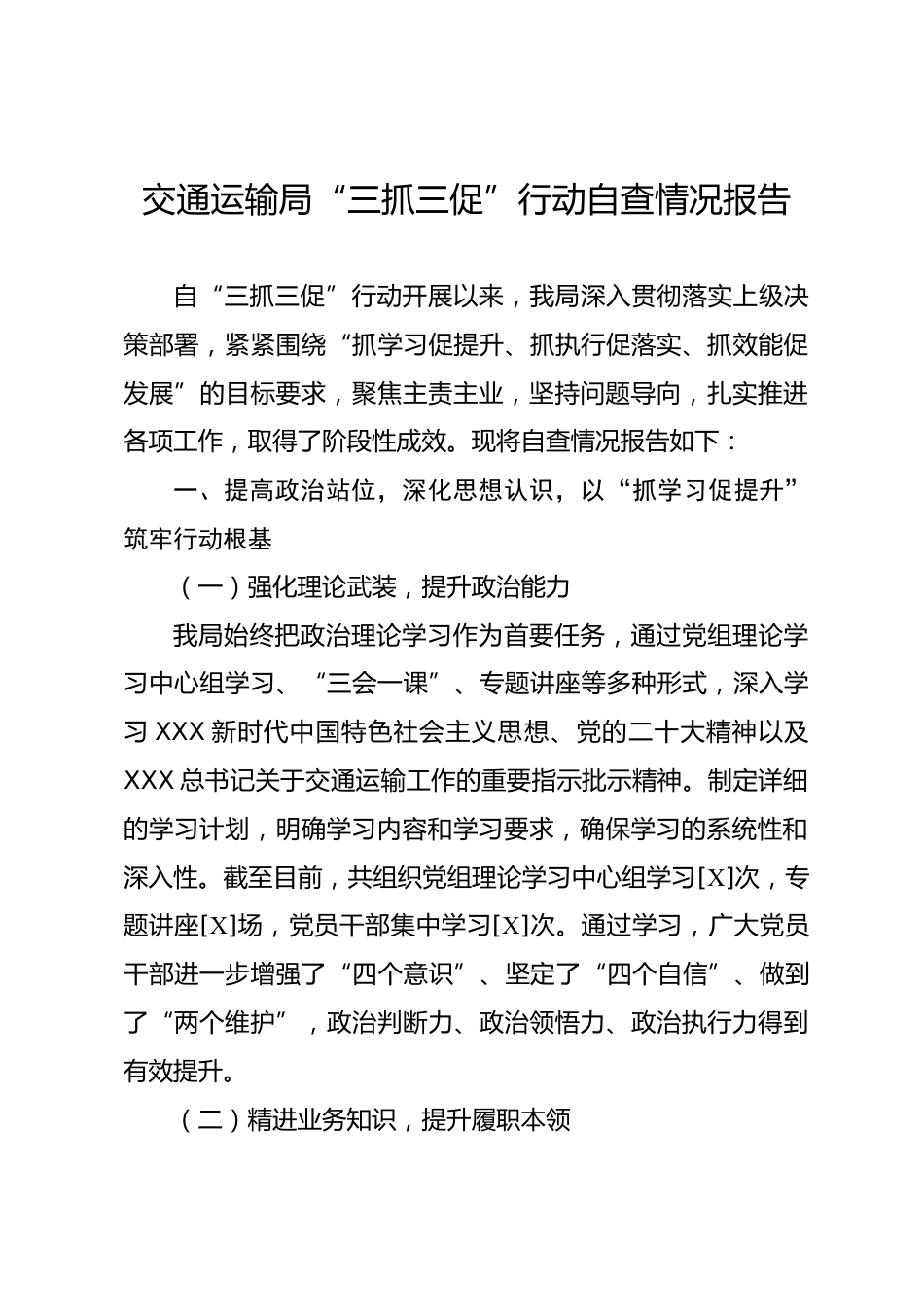 交通運(yùn)輸局“三抓三促”行動(dòng)自查情況報(bào)告自“三抓三促”行動(dòng)開展以來,我局深入貫徹落實(shí)上級(jí)決策部署,緊緊圍繞“抓學(xué)習(xí)促提升、抓執(zhí)行促落實(shí)、抓效能促發(fā)展”的目標(biāo)要求,聚焦主責(zé)主業(yè),堅(jiān)持問題導(dǎo)向,扎實(shí)推進(jìn)各項(xiàng)工作,取得了階段性成效?,F(xiàn)將自查情況報(bào)告如下:一、提高政治站位,深化思想認(rèn)識(shí),以“抓學(xué)習(xí)促提升”筑牢行動(dòng)根基(一)強(qiáng)化理論武裝,提升政治能力我局始終把政治理論學(xué)習(xí)作為首要任務(wù),通過黨組理論學(xué)習(xí)中心組學(xué)習(xí)、“三會(huì)一課”、專題講座等多種形式,深入學(xué)習(xí)XXX新時(shí)代中國特色社會(huì)主義思想、黨的二十大精神以及XXX總書記關(guān)于交通運(yùn)輸工作的重要指示...