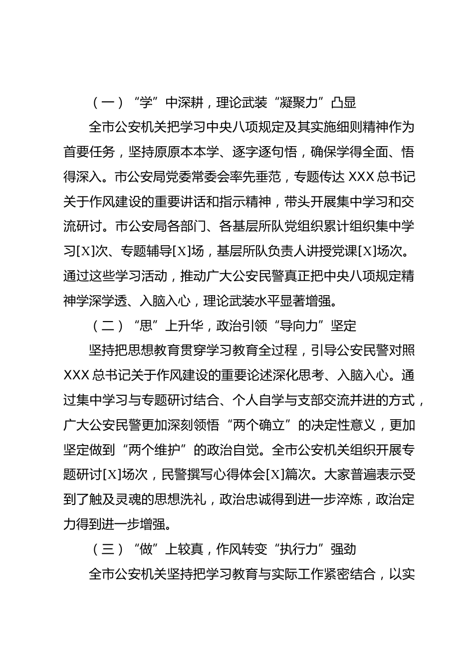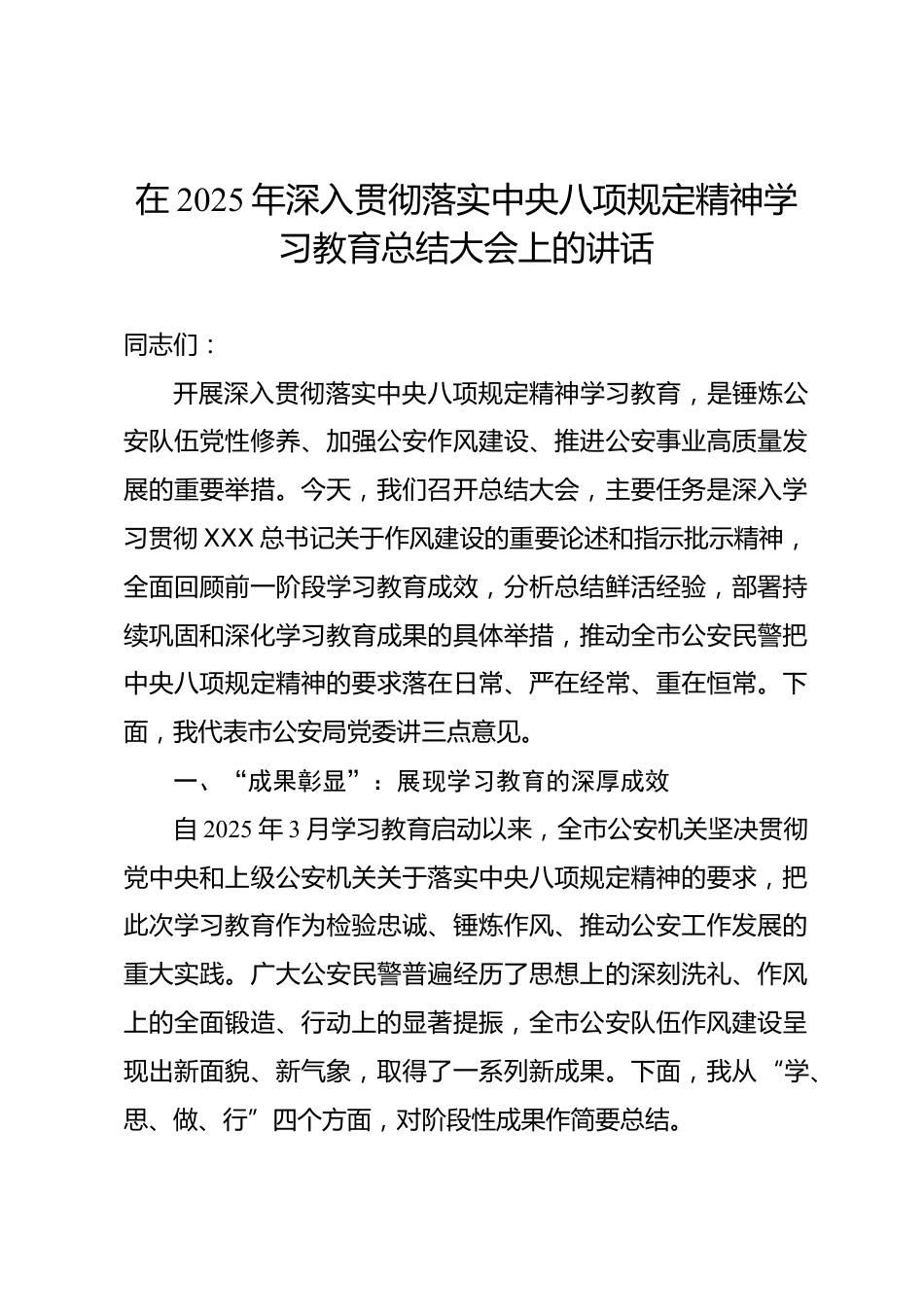 在2025年深入貫徹落實(shí)中央八項(xiàng)規(guī)定精神學(xué)習(xí)教育總結(jié)大會(huì)上的講話同志們:開展深入貫徹落實(shí)中央八項(xiàng)規(guī)定精神學(xué)習(xí)教育,是錘煉公安隊(duì)伍黨性修養(yǎng)、加強(qiáng)公安作風(fēng)建設(shè)、推進(jìn)公安事業(yè)高質(zhì)量發(fā)展的重要舉措。今天,我們召開總結(jié)大會(huì),主要任務(wù)是深入學(xué)習(xí)貫徹XXX總書記關(guān)于作風(fēng)建設(shè)的重要論述和指示批示精神,全面回顧前一階段學(xué)習(xí)教育成效,分析總結(jié)鮮活經(jīng)驗(yàn),部署持續(xù)鞏固和深化學(xué)習(xí)教育成果的具體舉措,推動(dòng)全市公安民警把中央八項(xiàng)規(guī)定精神的要求落在日常、嚴(yán)在經(jīng)常、重在恒常。下面,我代表市公安局黨委講三點(diǎn)意見。一、“成果彰顯”:展現(xiàn)學(xué)習(xí)教育的深厚成效自2025年3月學(xué)習(xí)...