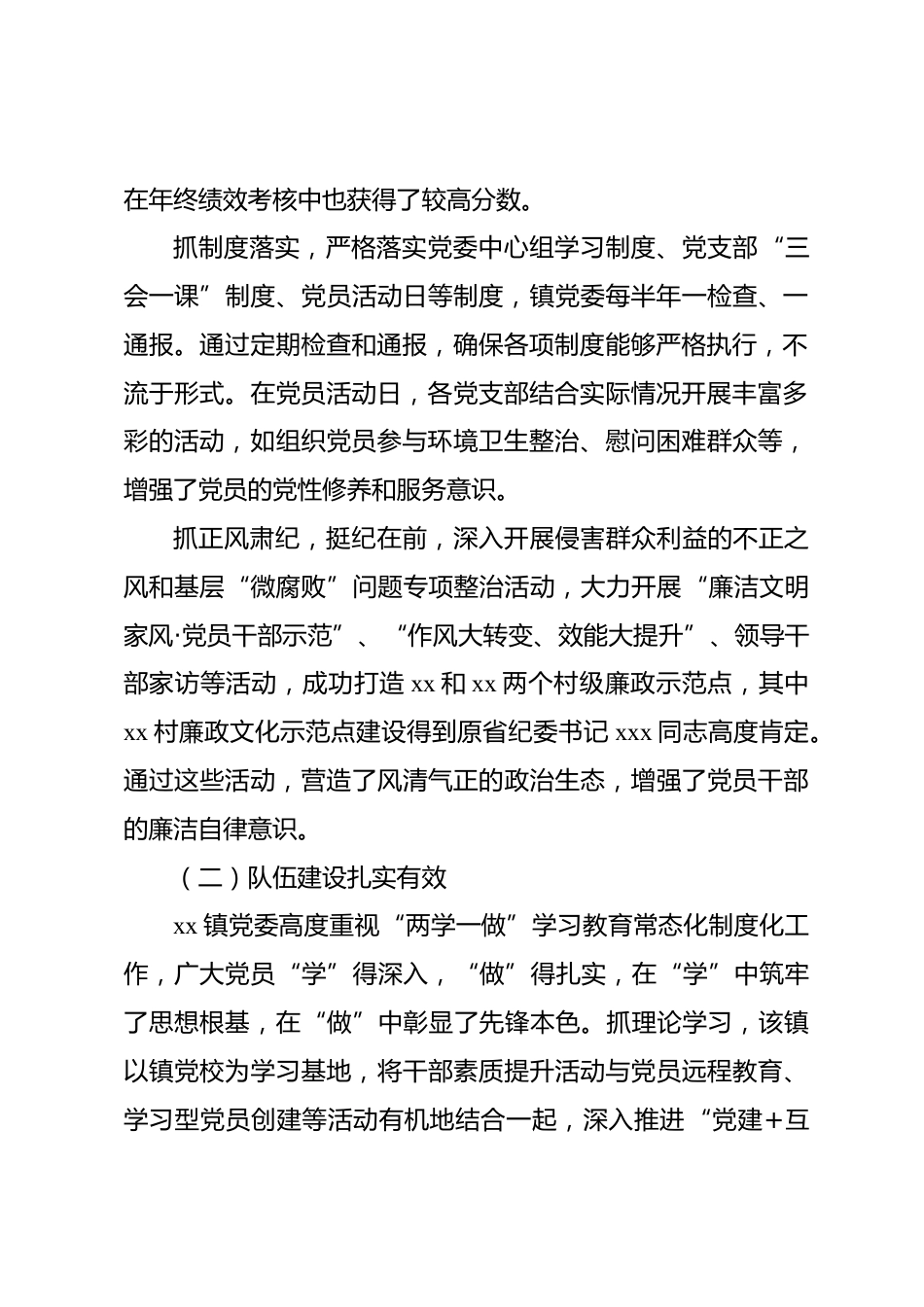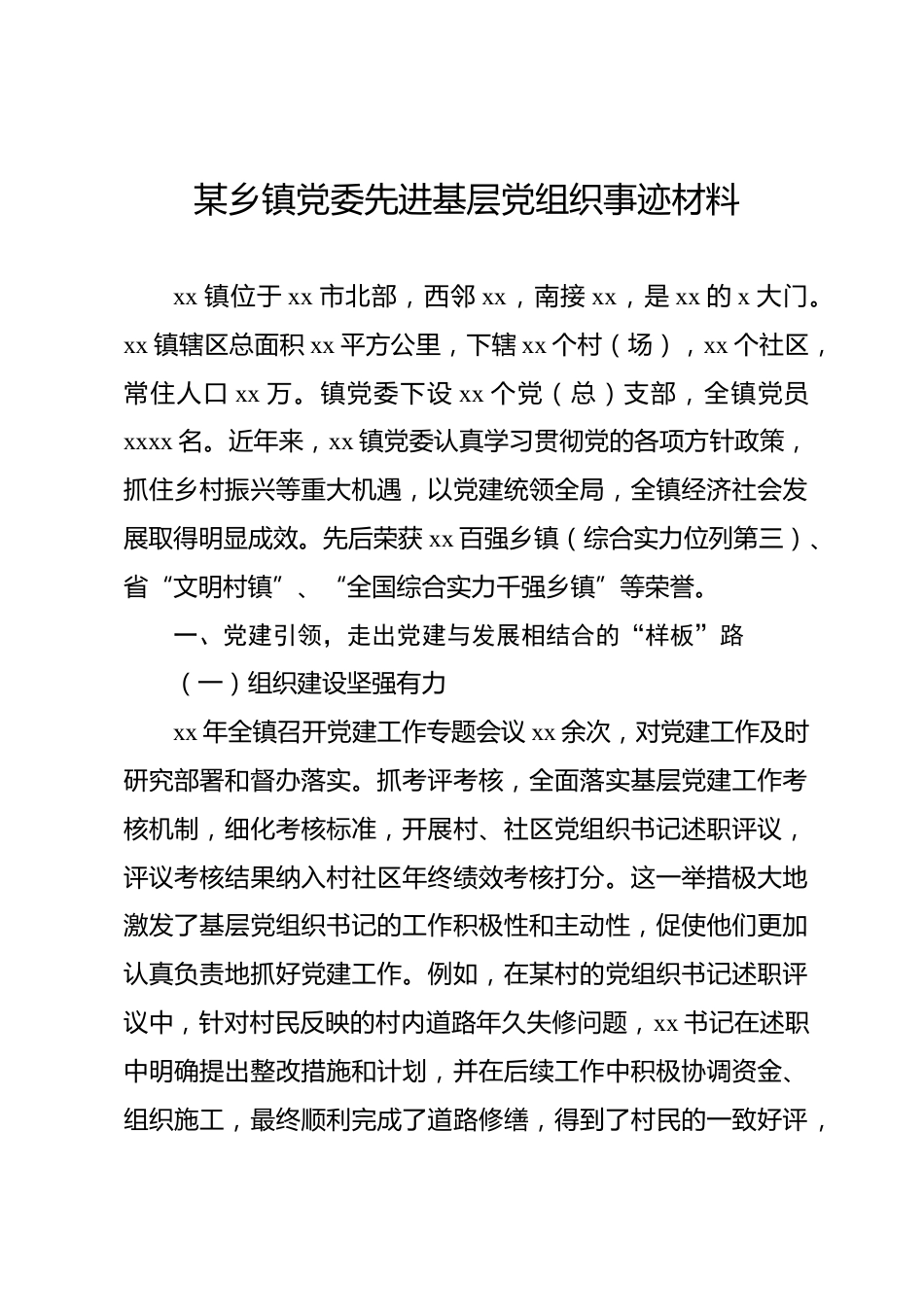某鄉(xiāng)鎮(zhèn)黨委先進(jìn)基層黨組織事跡材料xx鎮(zhèn)位于xx市北部,西鄰xx,南接xx,是xx的x大門。xx鎮(zhèn)轄區(qū)總面積xx平方公里,下轄xx個村(場),xx個社區(qū),常住人口xx萬。鎮(zhèn)黨委下設(shè)xx個黨(總)支部,全鎮(zhèn)黨員xxxx名。近年來,xx鎮(zhèn)黨委認(rèn)真學(xué)習(xí)貫徹黨的各項方針政策,抓住鄉(xiāng)村振興等重大機(jī)遇,以黨建統(tǒng)領(lǐng)全局,全鎮(zhèn)經(jīng)濟(jì)社會發(fā)展取得明顯成效。先后榮獲xx百強(qiáng)鄉(xiāng)鎮(zhèn)(綜合實力位列第三)、省“文明村鎮(zhèn)”、“全國綜合實力千強(qiáng)鄉(xiāng)鎮(zhèn)”等榮譽(yù)。一、黨建引領(lǐng),走出黨建與發(fā)展相結(jié)合的“樣板”路(一)組織建設(shè)堅強(qiáng)有力xx年全鎮(zhèn)召開黨建工作專題會議xx余次,對黨建工作及時研究部署和督辦落...