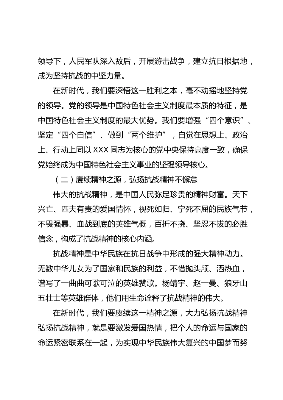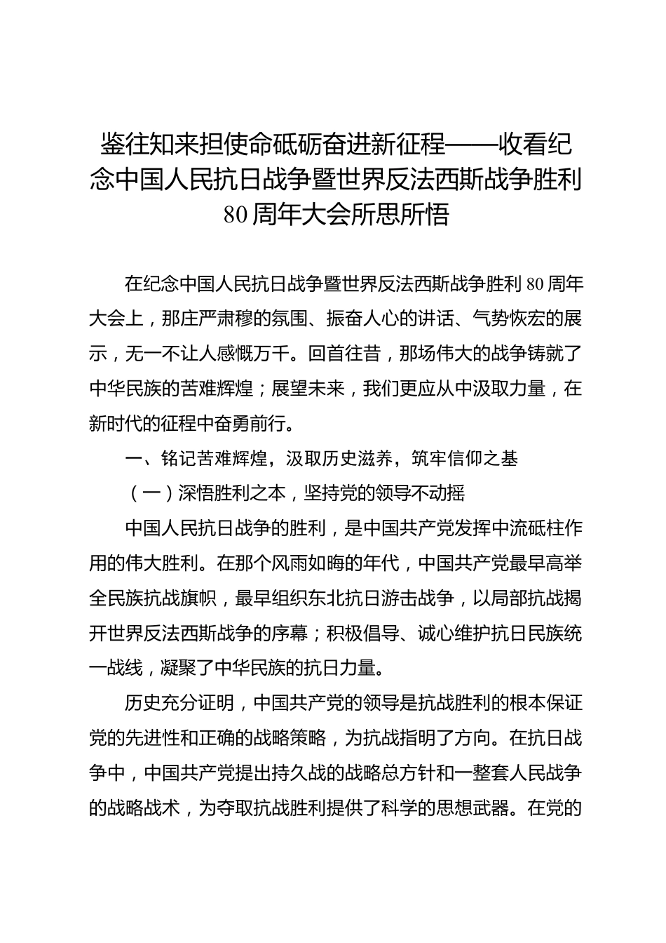 鑒往知來(lái)?yè)?dān)使命砥礪奮進(jìn)新征程——收看紀(jì)念中國(guó)人民抗日戰(zhàn)爭(zhēng)暨世界反法西斯戰(zhàn)爭(zhēng)勝利80周年大會(huì)所思所悟在紀(jì)念中國(guó)人民抗日戰(zhàn)爭(zhēng)暨世界反法西斯戰(zhàn)爭(zhēng)勝利80周年大會(huì)上,那莊嚴(yán)肅穆的氛圍、振奮人心的講話、氣勢(shì)恢宏的展示,無(wú)一不讓人感慨萬(wàn)千?;厥淄?,那場(chǎng)偉大的戰(zhàn)爭(zhēng)鑄就了中華民族的苦難輝煌;展望未來(lái),我們更應(yīng)從中汲取力量,在新時(shí)代的征程中奮勇前行。一、銘記苦難輝煌,汲取歷史滋養(yǎng),筑牢信仰之基(一)深悟勝利之本,堅(jiān)持黨的領(lǐng)導(dǎo)不動(dòng)搖中國(guó)人民抗日戰(zhàn)爭(zhēng)的勝利,是中國(guó)共產(chǎn)黨發(fā)揮中流砥柱作用的偉大勝利。在那個(gè)風(fēng)雨如晦的年代,中國(guó)共產(chǎn)黨最早高舉全民族抗戰(zhàn)旗...