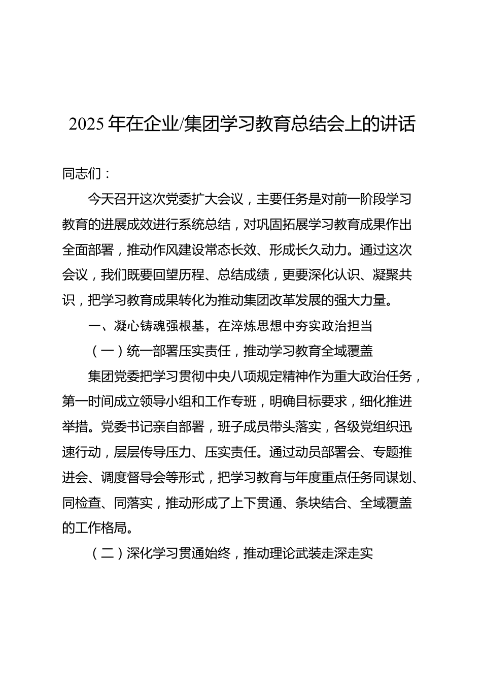 2025年在企業(yè)/集團(tuán)學(xué)習(xí)教育總結(jié)會(huì)上的講話同志們:今天召開(kāi)這次黨委擴(kuò)大會(huì)議,主要任務(wù)是對(duì)前一階段學(xué)習(xí)教育的進(jìn)展成效進(jìn)行系統(tǒng)總結(jié),對(duì)鞏固拓展學(xué)習(xí)教育成果作出全面部署,推動(dòng)作風(fēng)建設(shè)常態(tài)長(zhǎng)效、形成長(zhǎng)久動(dòng)力。通過(guò)這次會(huì)議,我們既要回望歷程、總結(jié)成績(jī),更要深化認(rèn)識(shí)、凝聚共識(shí),把學(xué)習(xí)教育成果轉(zhuǎn)化為推動(dòng)集團(tuán)改革發(fā)展的強(qiáng)大力量。一、凝心鑄魂強(qiáng)根基,在淬煉思想中夯實(shí)政治擔(dān)當(dāng)(一)統(tǒng)一部署壓實(shí)責(zé)任,推動(dòng)學(xué)習(xí)教育全域覆蓋集團(tuán)黨委把學(xué)習(xí)貫徹中央八項(xiàng)規(guī)定精神作為重大政治任務(wù),第一時(shí)間成立領(lǐng)導(dǎo)小組和工作專(zhuān)班,明確目標(biāo)要求,細(xì)化推進(jìn)舉措。黨委書(shū)記親自部署,...
