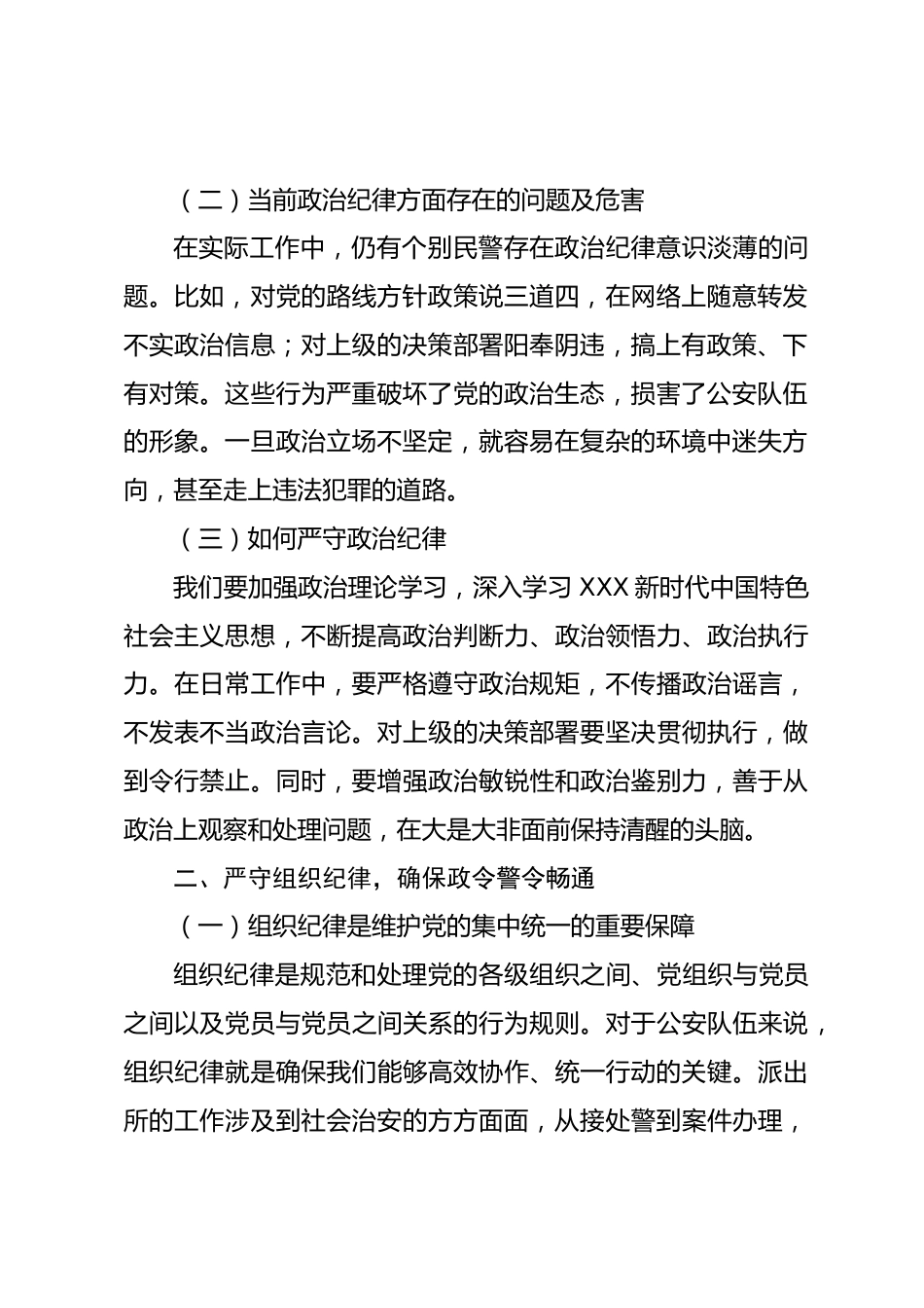 嚴(yán)守六大紀(jì)律,鍛造忠誠(chéng)警魂——2024年派出所黨紀(jì)學(xué)習(xí)教育黨課同志們:今天來(lái)到咱們派出所,和大家圍繞2024年黨紀(jì)學(xué)習(xí)教育中的六大紀(jì)律展開(kāi)交流。黨的紀(jì)律是黨的生命線,對(duì)于我們公安隊(duì)伍,尤其是身處基層一線的派出所民警而言,嚴(yán)守六大紀(jì)律不僅是對(duì)黨忠誠(chéng)的體現(xiàn),更是履行好職責(zé)使命、維護(hù)社會(huì)公平正義的重要保障。下面,我就從政治紀(jì)律、組織紀(jì)律、廉潔紀(jì)律、群眾紀(jì)律、工作紀(jì)律和生活紀(jì)律這六個(gè)方面,和大家深入探討。一、嚴(yán)守政治紀(jì)律,做政治上的明白人(一)政治紀(jì)律是黨的最根本、最重要的紀(jì)律政治紀(jì)律是維護(hù)黨的團(tuán)結(jié)統(tǒng)一的根本保證,是各級(jí)黨組織和全體黨員在政...